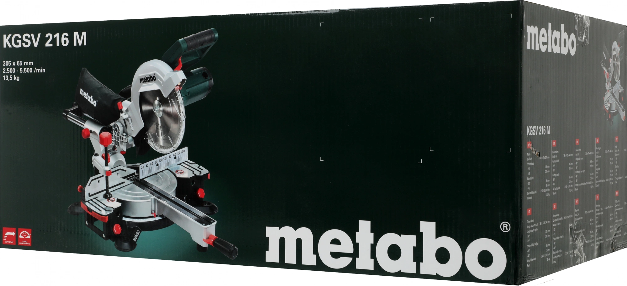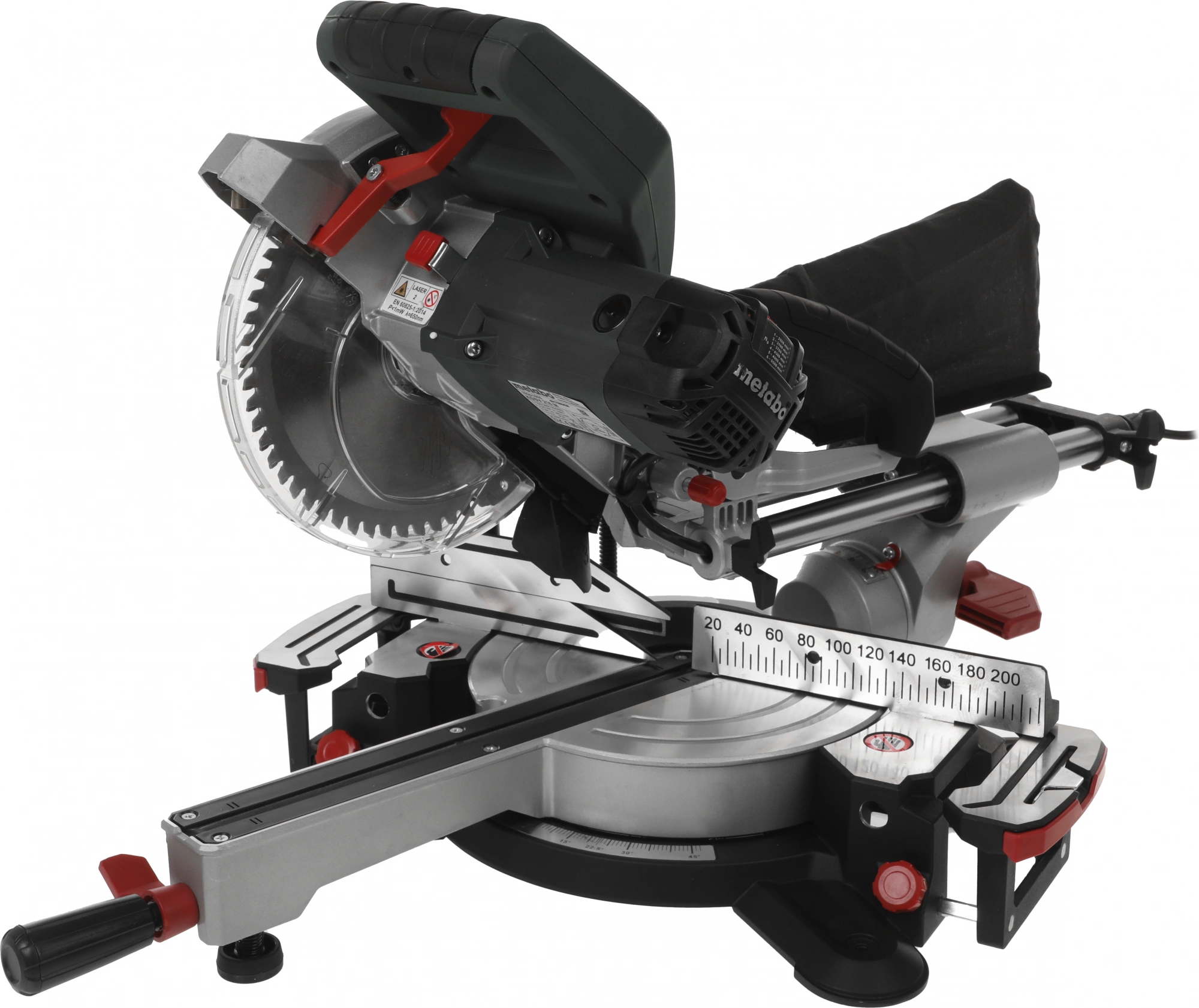 Торцовочная пила, твердосплавное пильное полотно (60 зубьев), 2 встроенных расширения стола, торцовочный упор, зажим для материала, инструмент для смены пильного диска, намотка кабеля, мешок для сбора опилок.