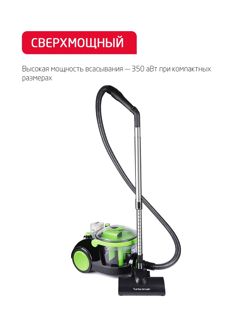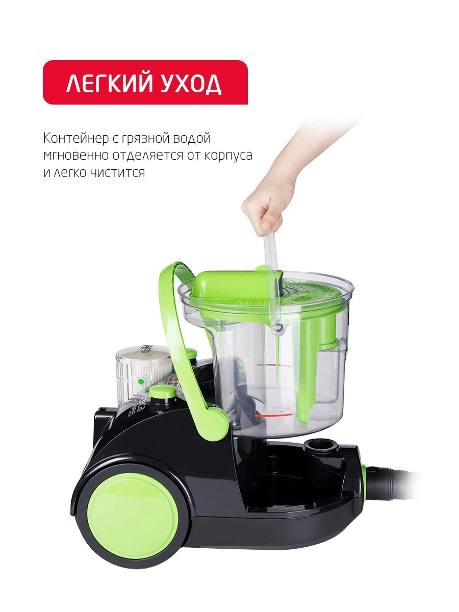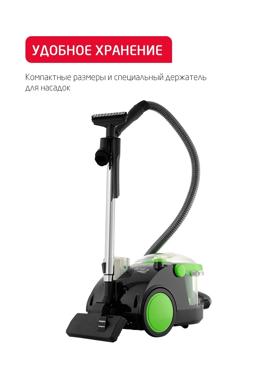 легко очищаемый пылесборник, место для хранения насадок, поворачивающиеся колеса, шланг