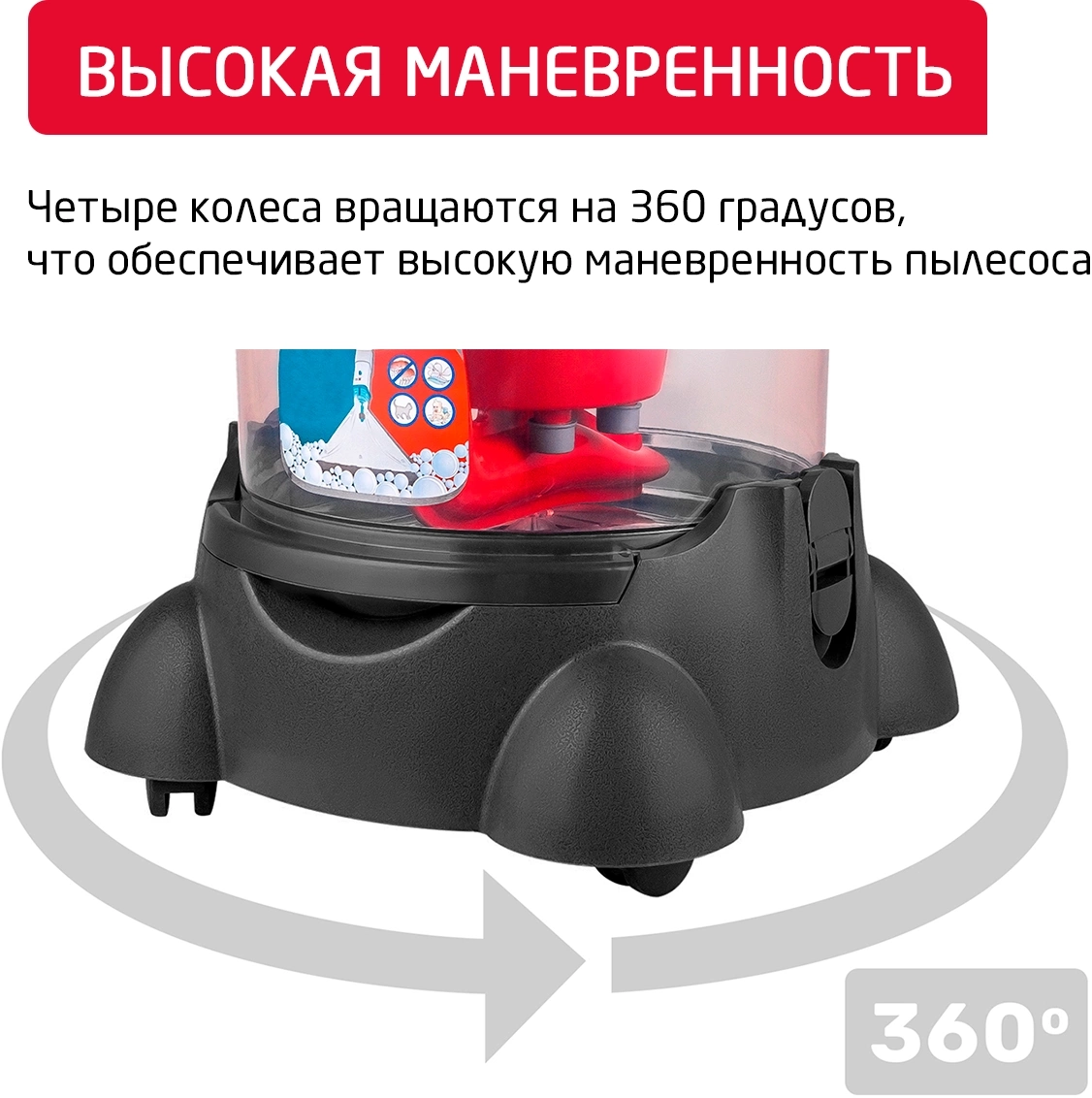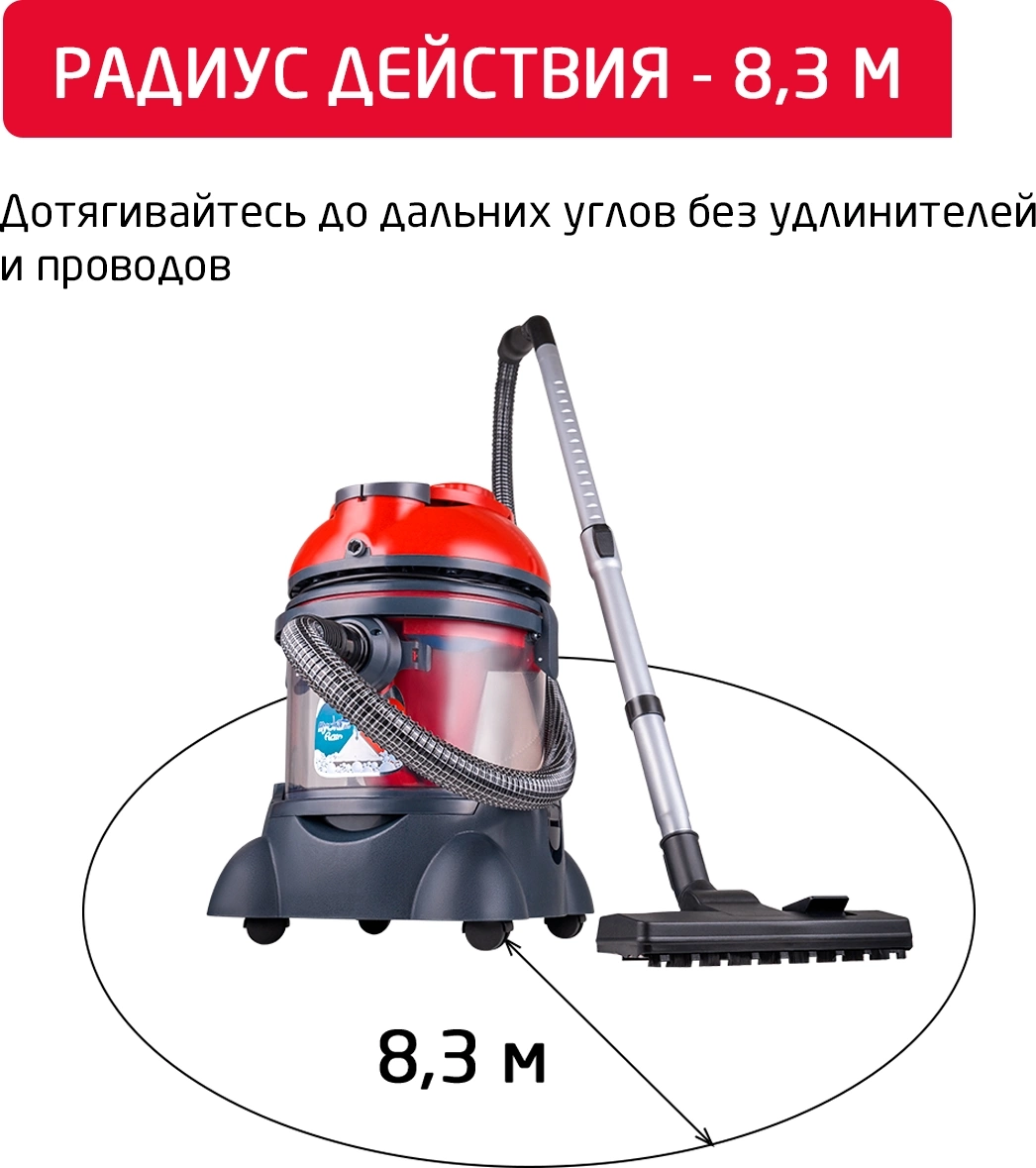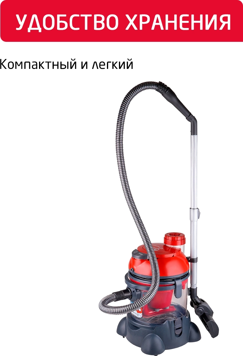 легко очищаемый пылесборник, место для хранения насадок, поворачивающиеся колеса, шланг