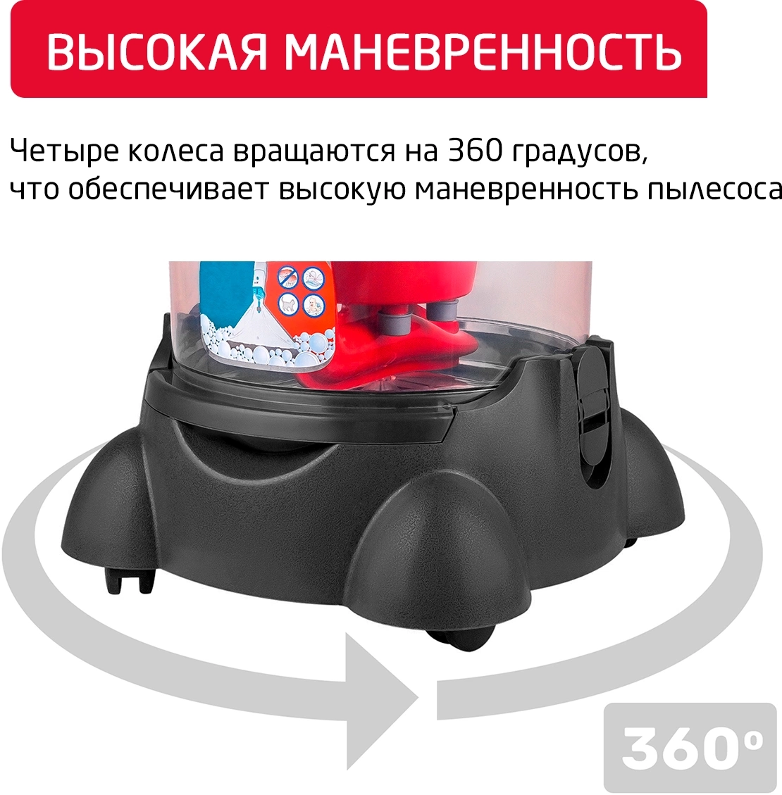 легко очищаемый пылесборник, поворачивающиеся колеса, шланг