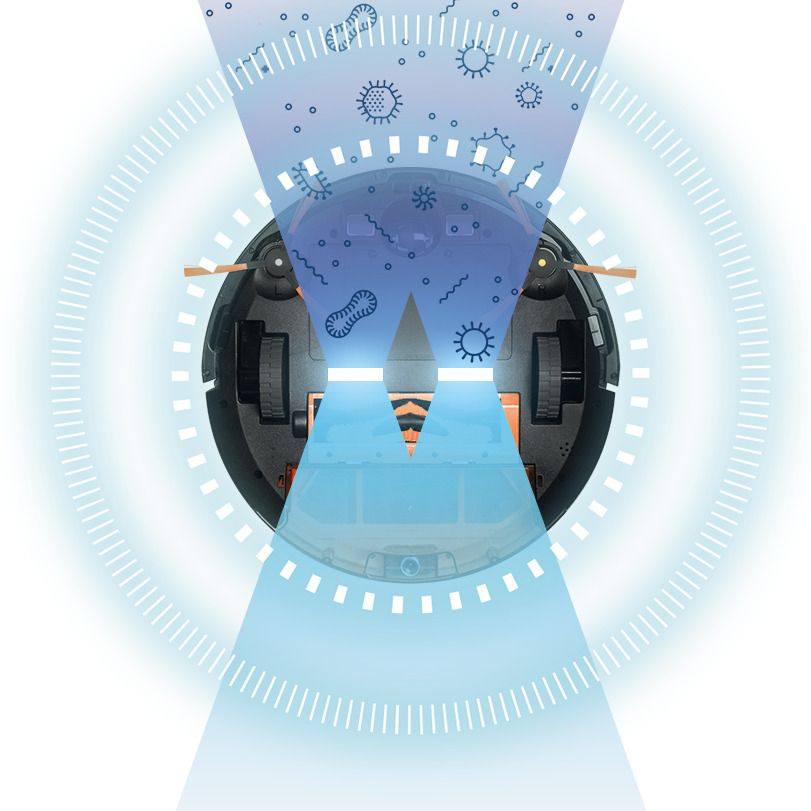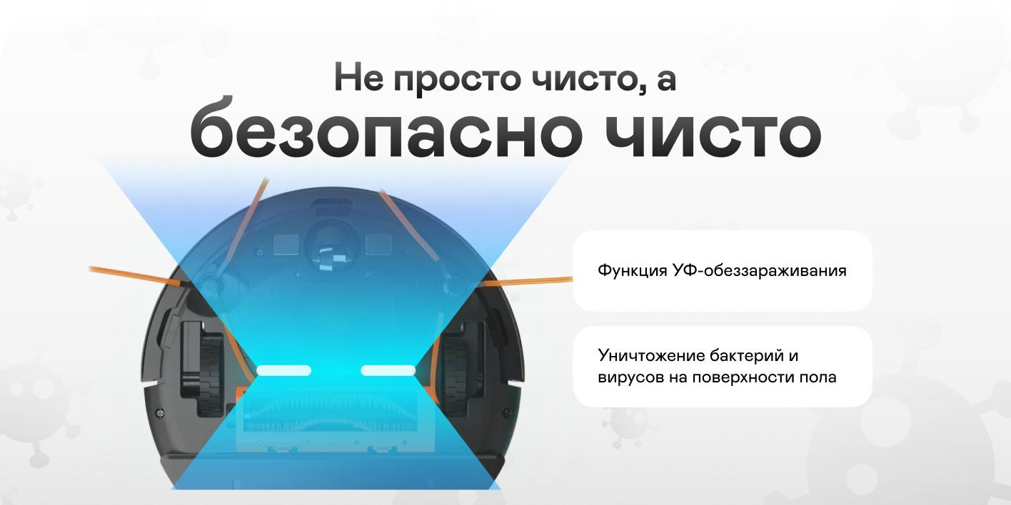 боковые щетки, датчик обнаружения препятствий, датчик падения, датчик перепада высоты, индикация застревания, мягкий бампер, ультрафиолетовая лампа