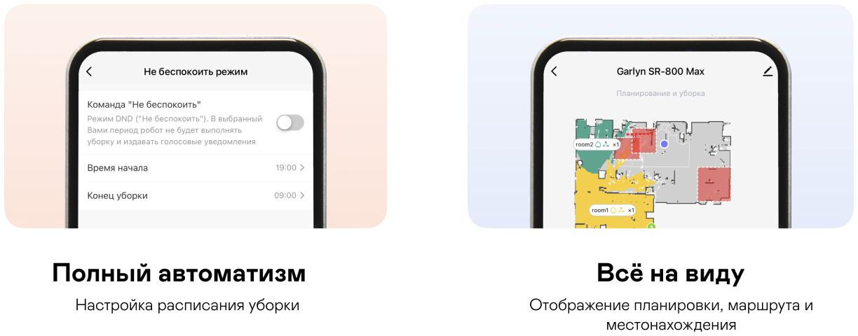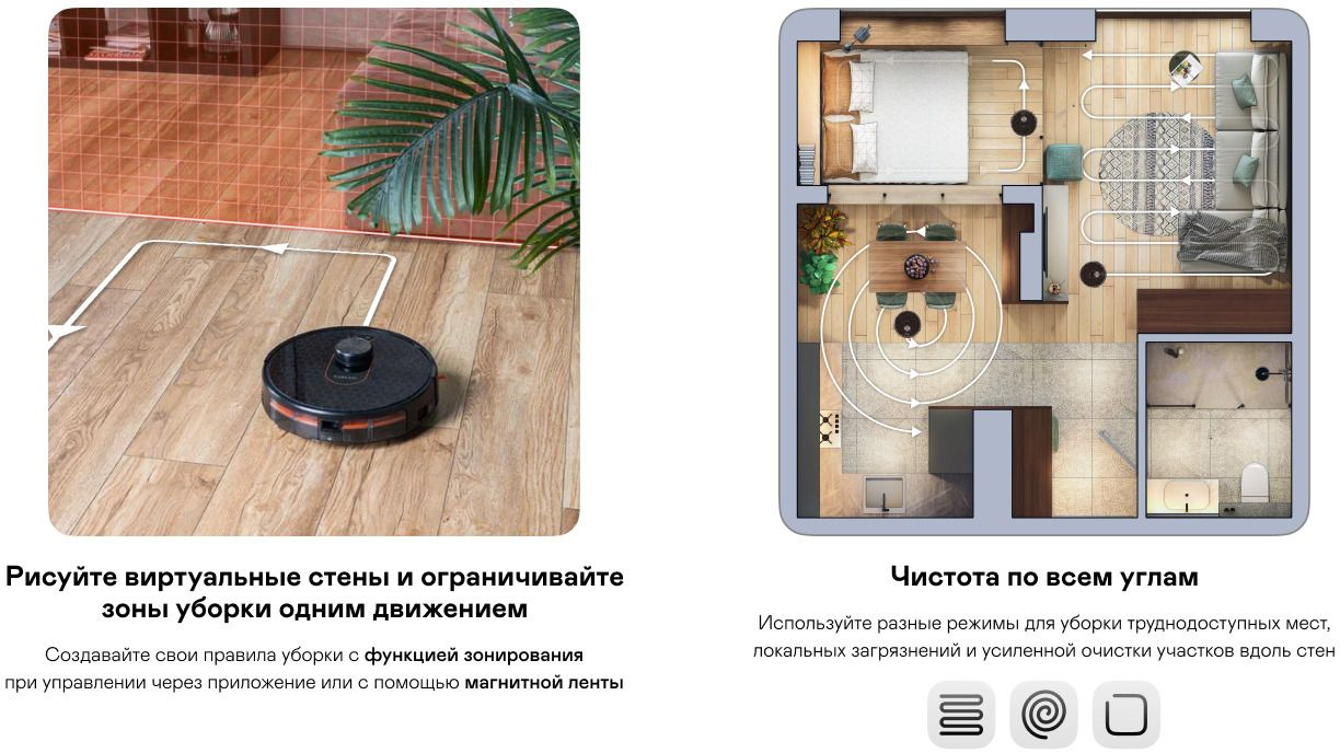 автоматическая работа, автоматический поиск зарядного устройства, выбор зоны, построение карты помещения, таймер включения, таймер на каждый день недели, уборка по расписанию, управление со смартфона