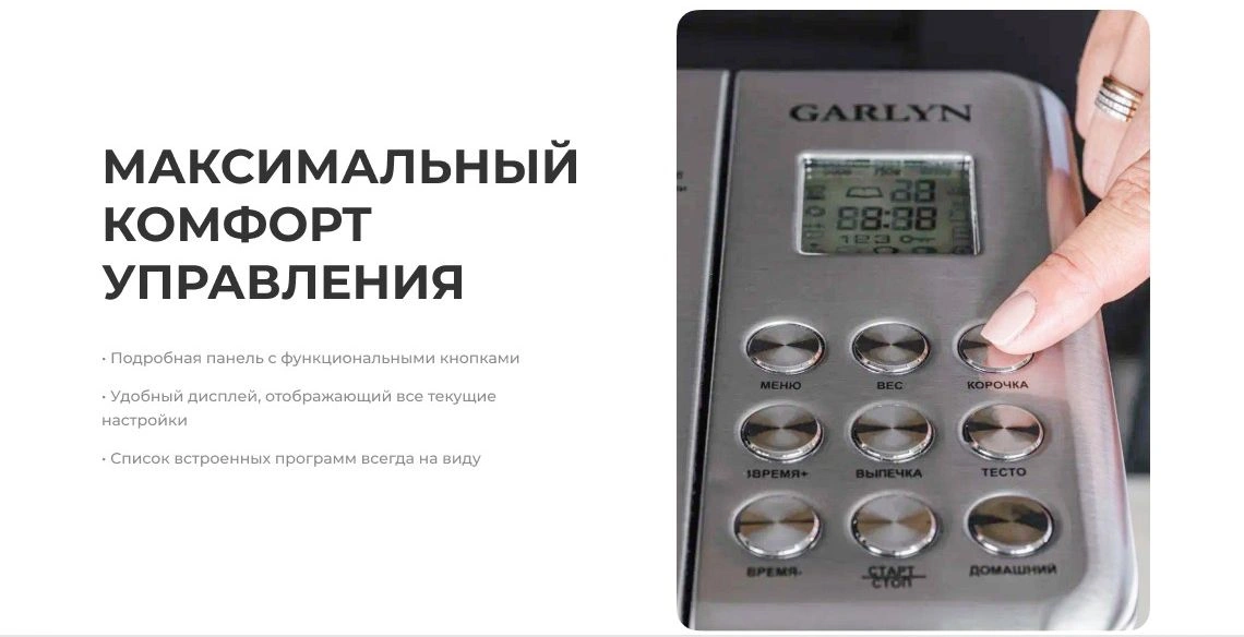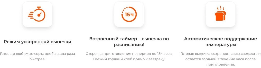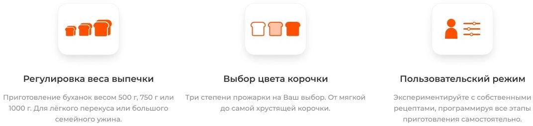 выбор цвета корочки, запоминание программы, поддержание температуры, регулировка веса выпечки, таймер отсрочки старта
