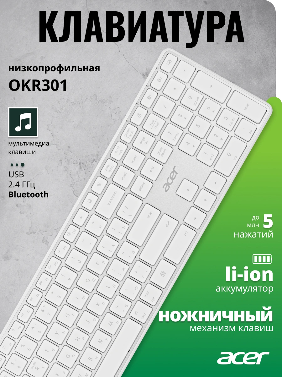 Ножничный механизм нажатия. Встроенный аккумулятор 500 mAh, поддержка трех устройств. Ноутбучный провиль клавиш.Мультимедийные клавиши.
