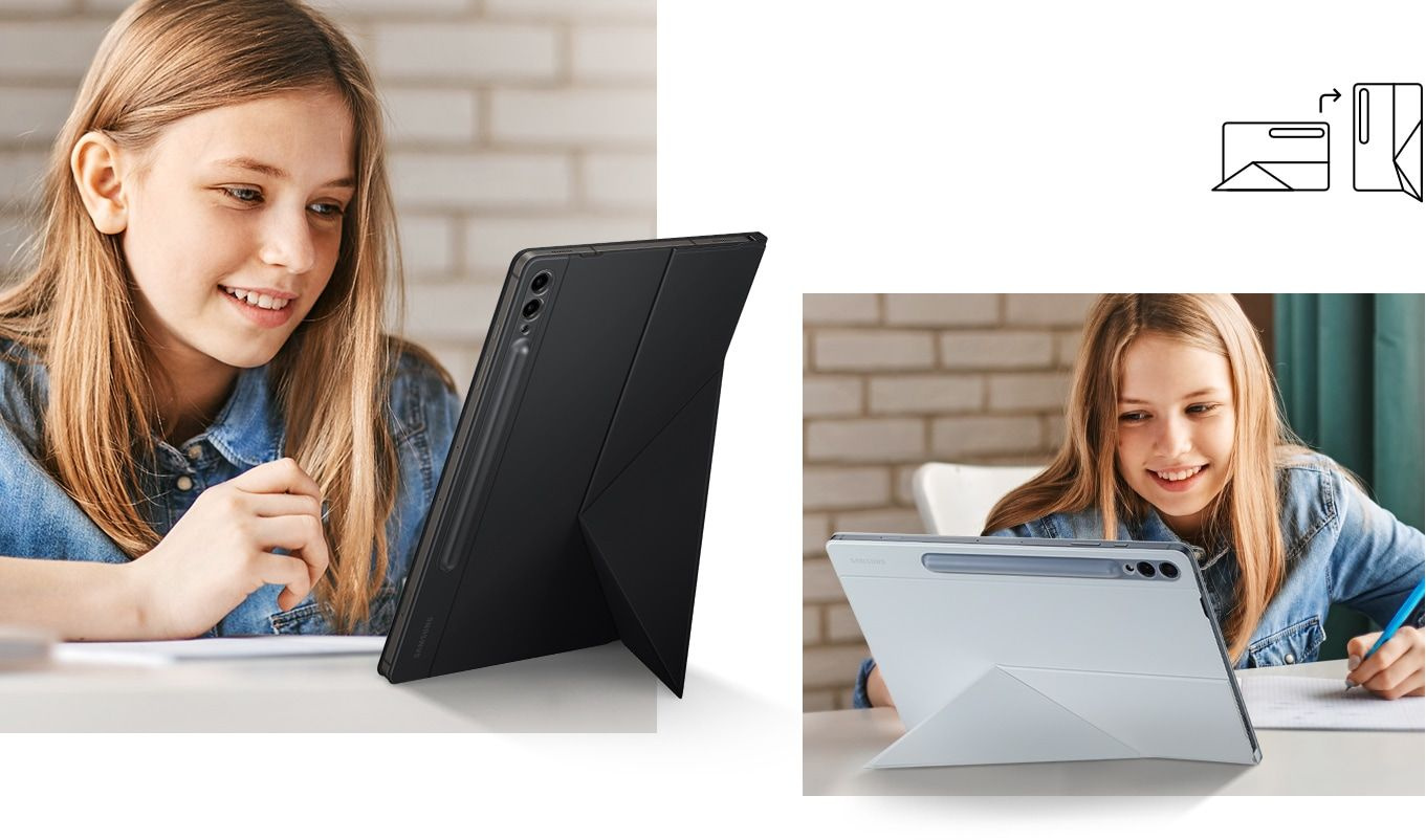 Защита корпуса и экрана, магнитное крепление, 2 варианта подставки, возможность установки вместе с другими чехлами-накладками на внешний экран, автоматическое включение/выключение экрана, встроенный отсек для электронного пера S Pen.