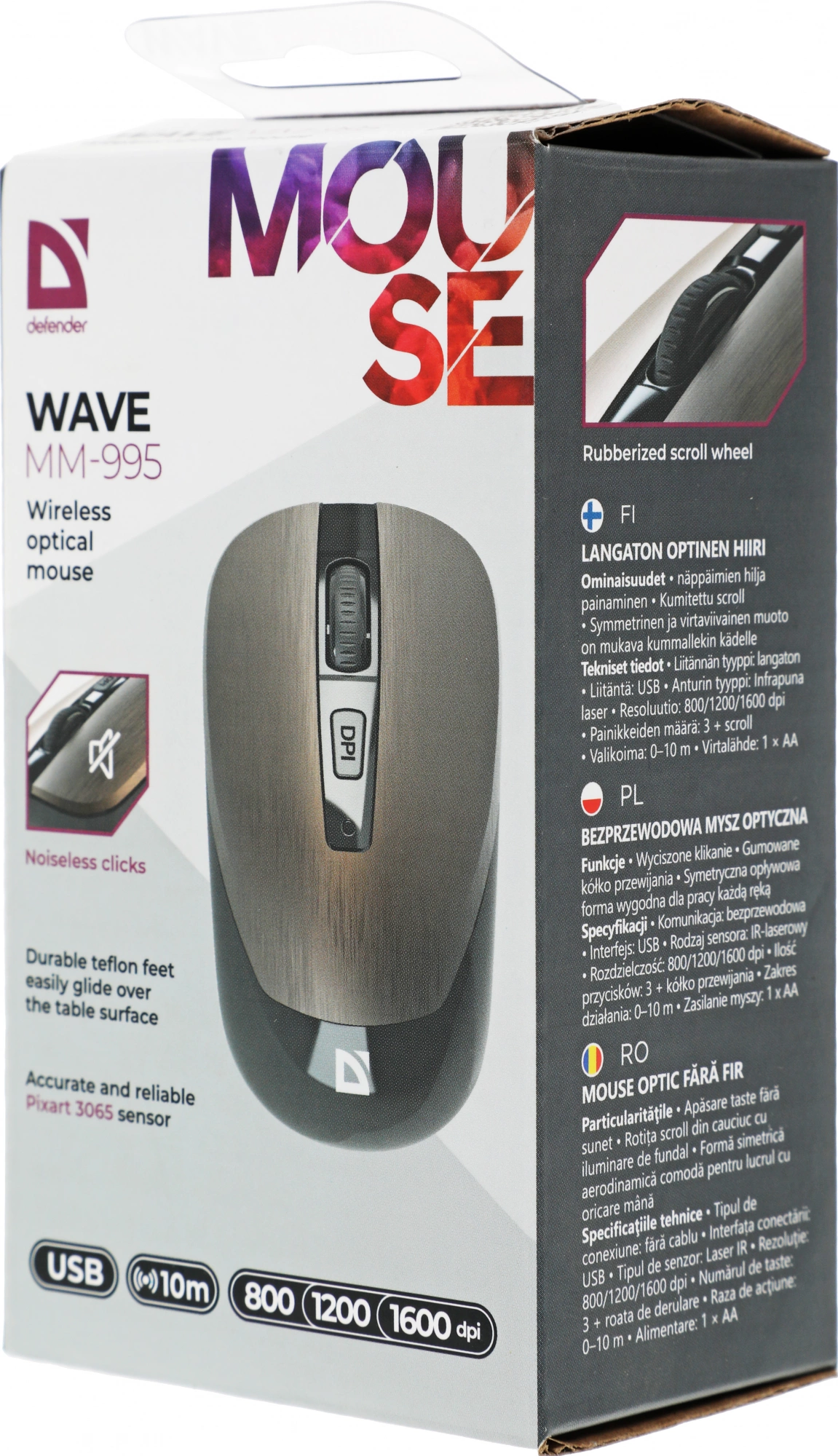 Точный и надёжный сенсор Pixart 3065. Бесшумное нажатие кнопок. Прорезиненное колесо прокрутки. Прочные тефлоновые ножки легко скользят по поверхности стола - Аккуратно снимите защитную пленку с тефлоновых ножек перед использованием.