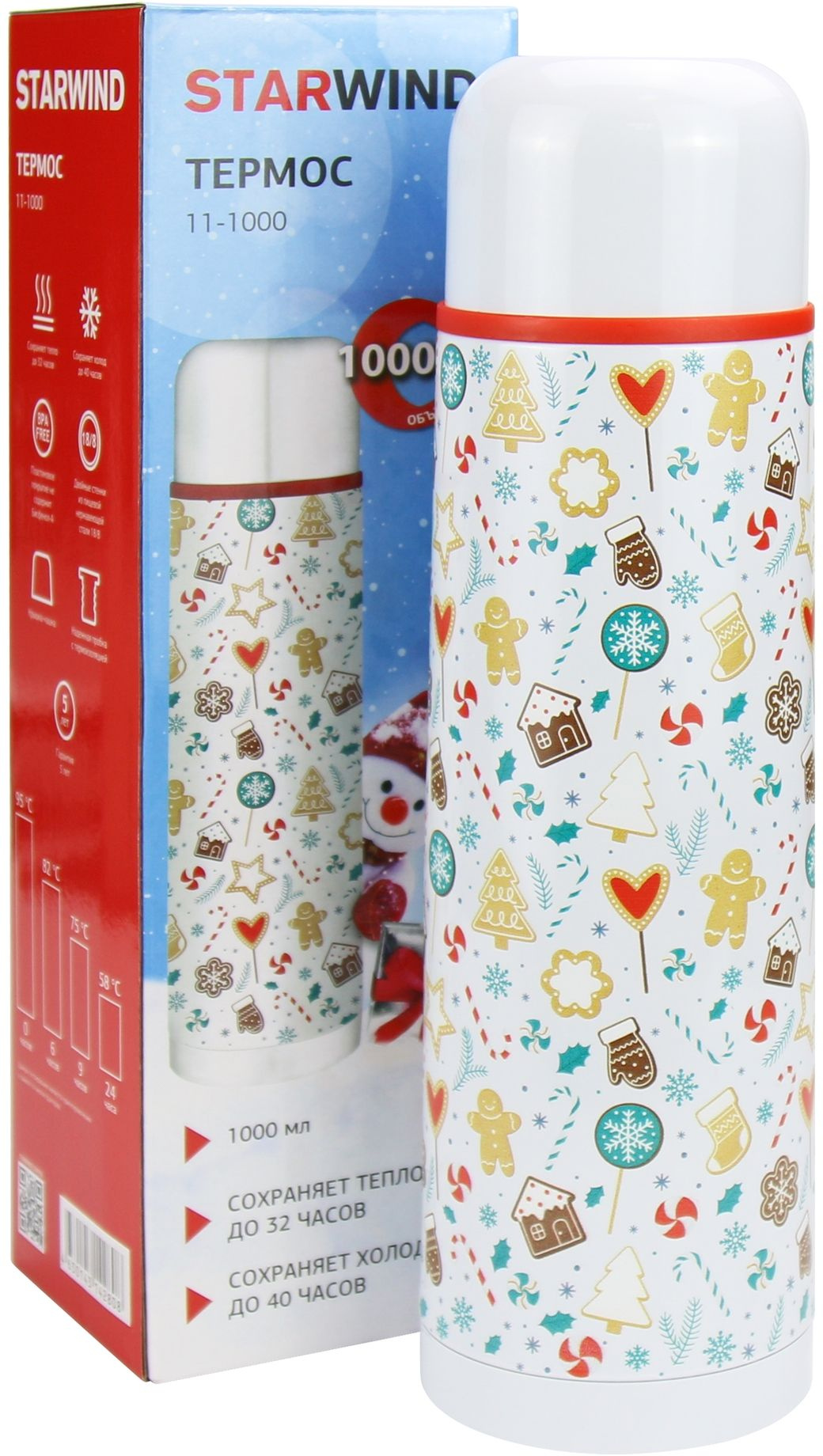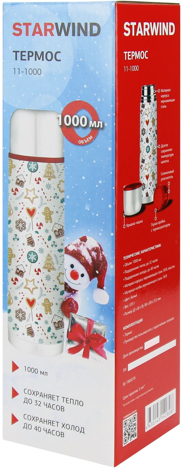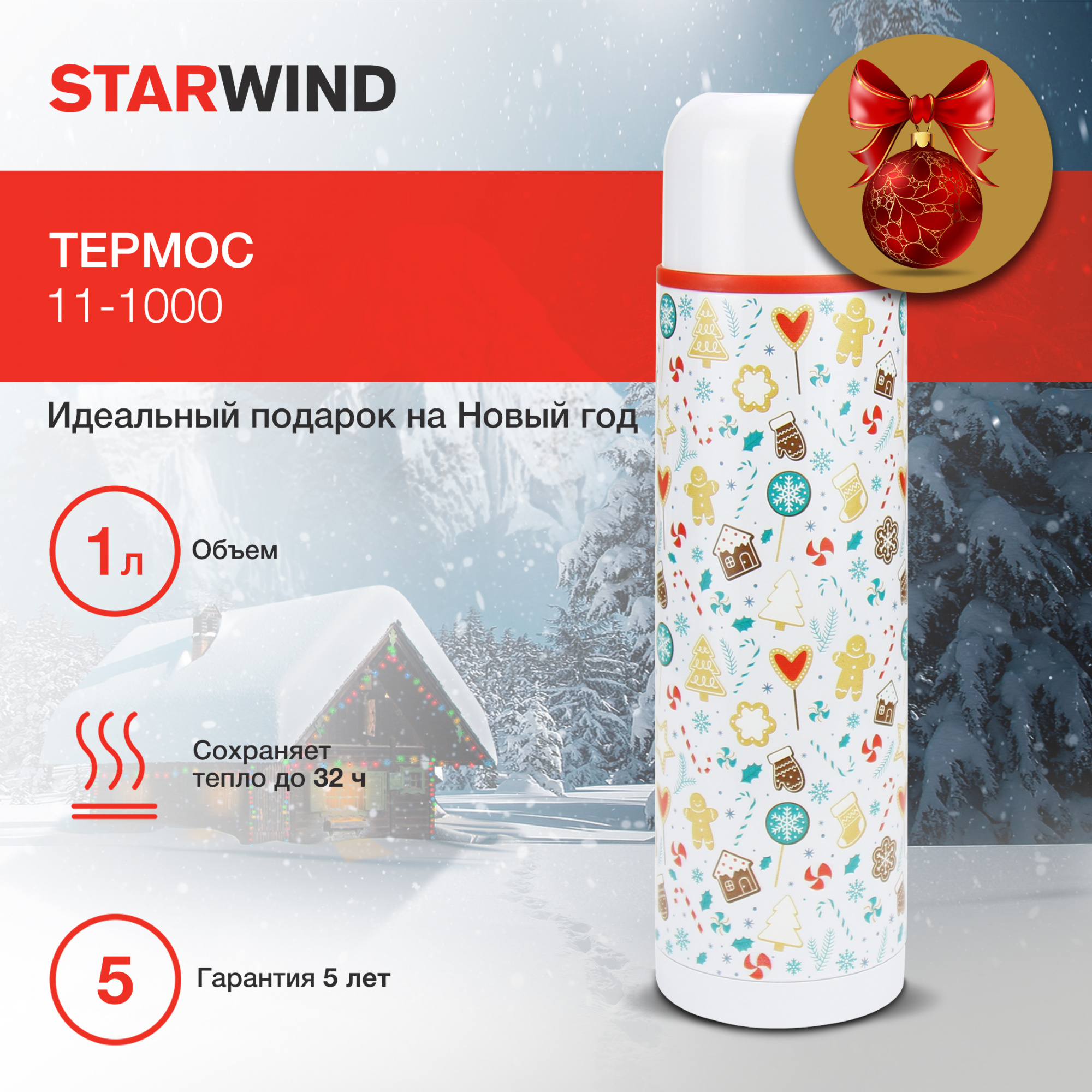 Термос Starwind New Year 11-1000 поможет согреться и сохранить праздничное настроение в любую погоду. Он способен вместить до 1 л чая, кофе, морса и другого напитка, сохранив их теплыми или прохладными в течение продолжительного периода.