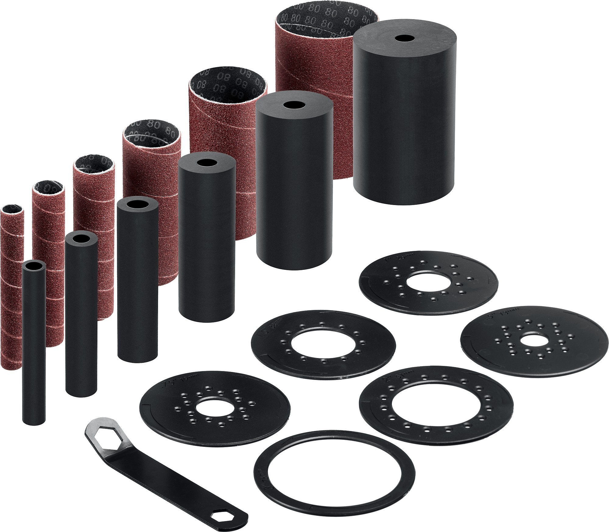 Станок в сборе, шлифовальные барабаны - 5 шт., абразивные шлифовальные втулки - 6 шт., встакви стола - 6 шт., ключ, комплект крепежа, руководство по эксплуатации.э