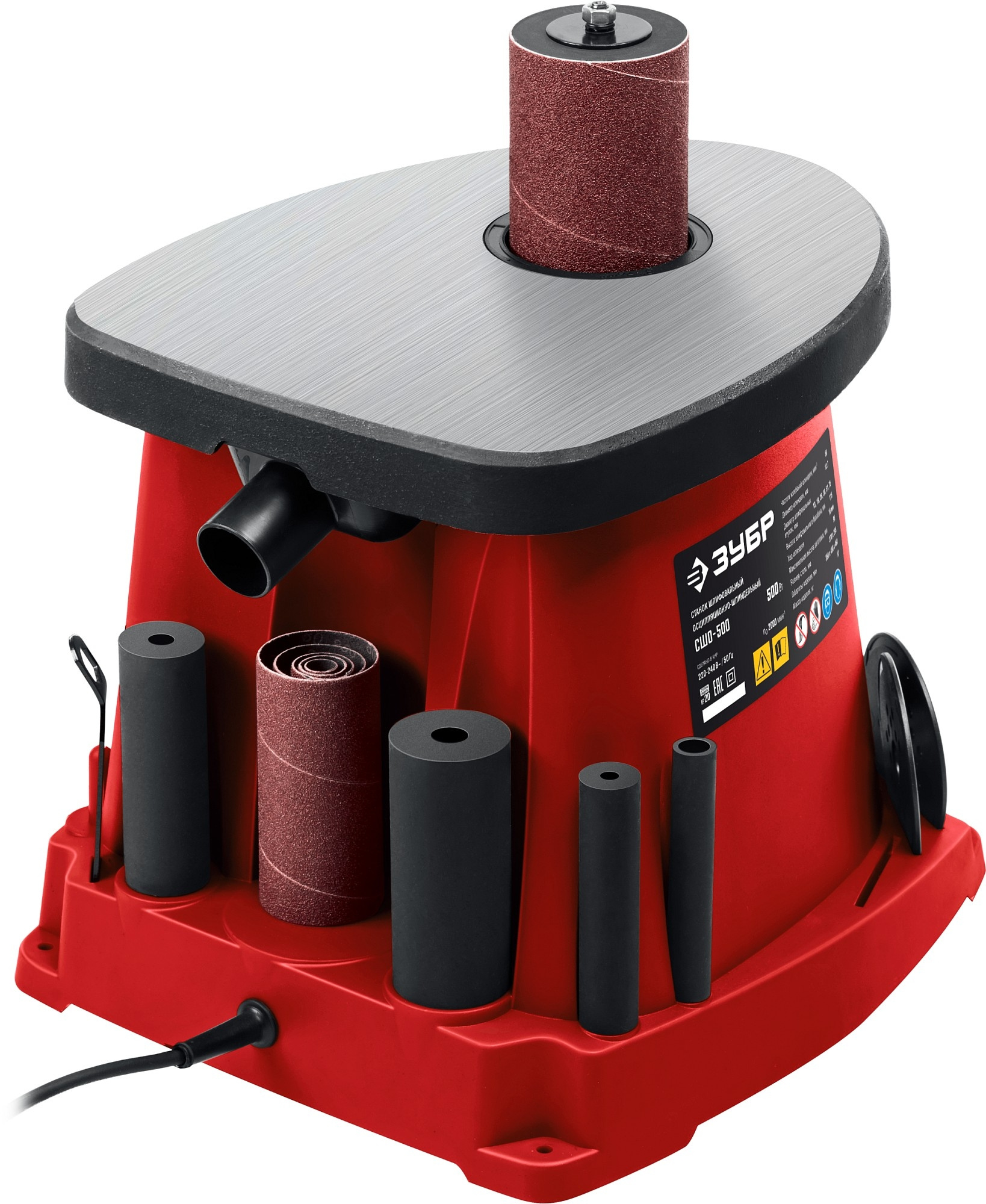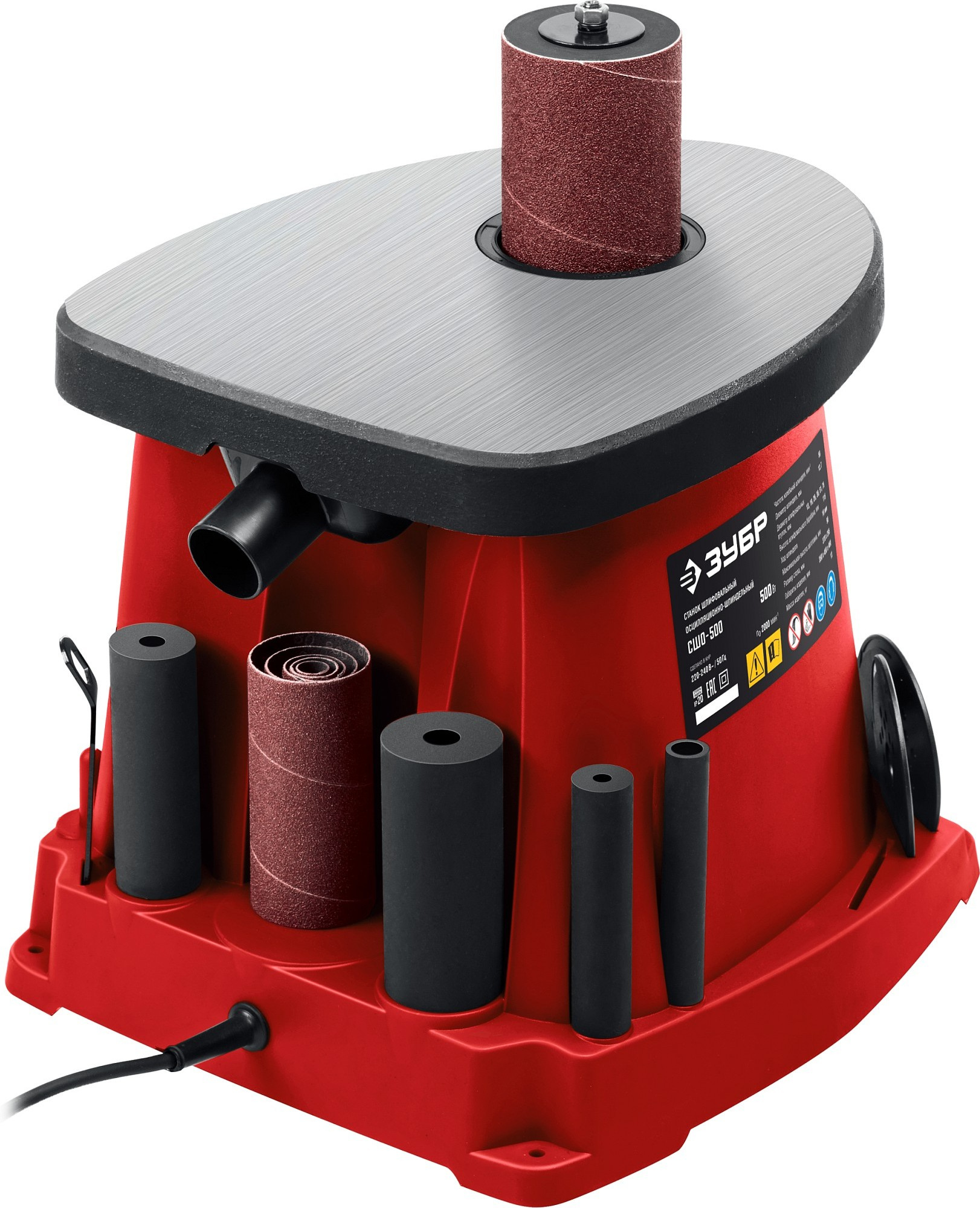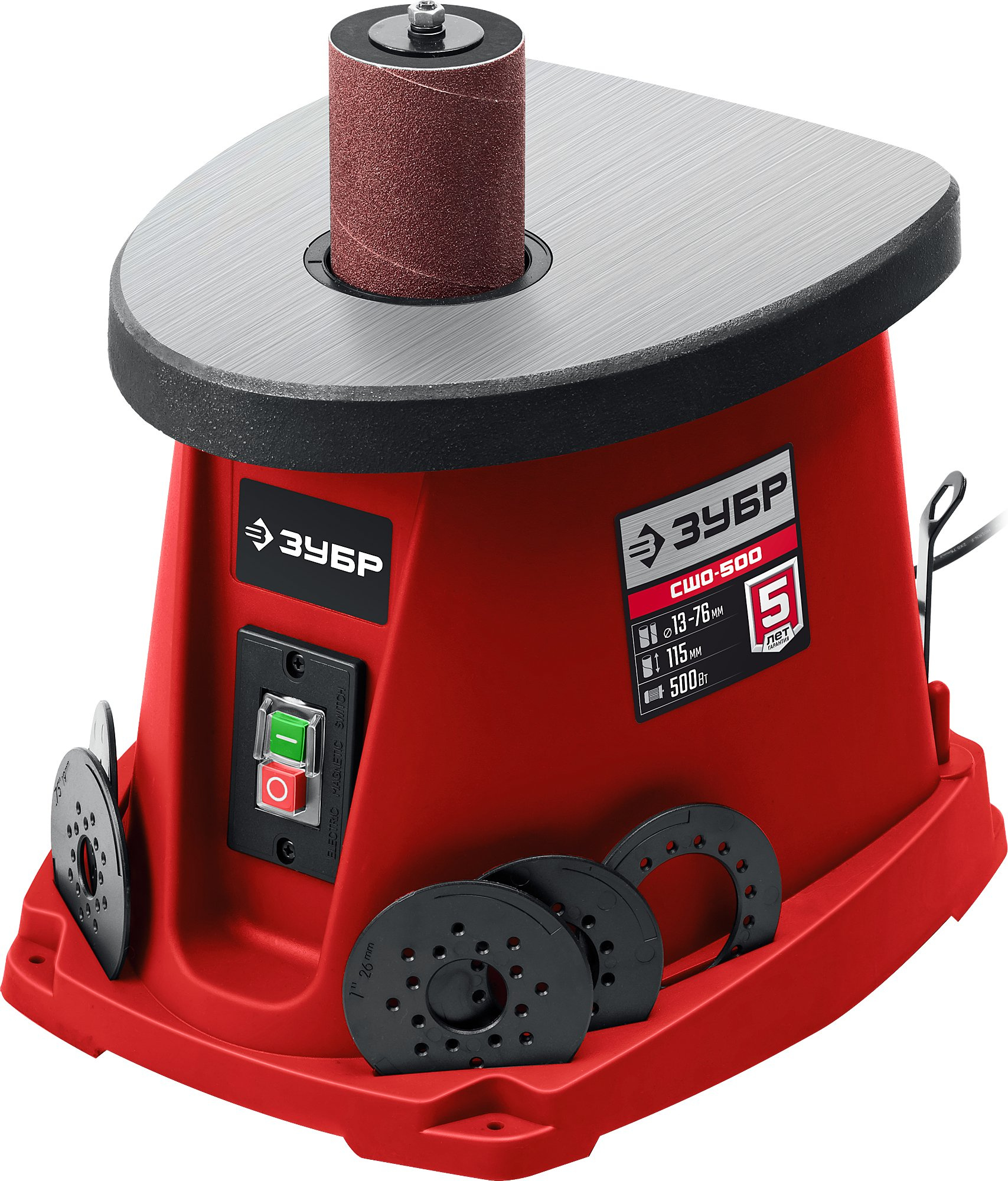 ЗУБР СШО-500 Осцилляционно-шпиндельный шлифовальный станок, предназначен для обработки шлифованием криволинейных и прямолинейных поверхностей, кромок и фасок деревянных заготовок путем вращательно-колебательных движений шпинделя. Набор барабанов и абразивных шлифовальных втулок входит в комплект.