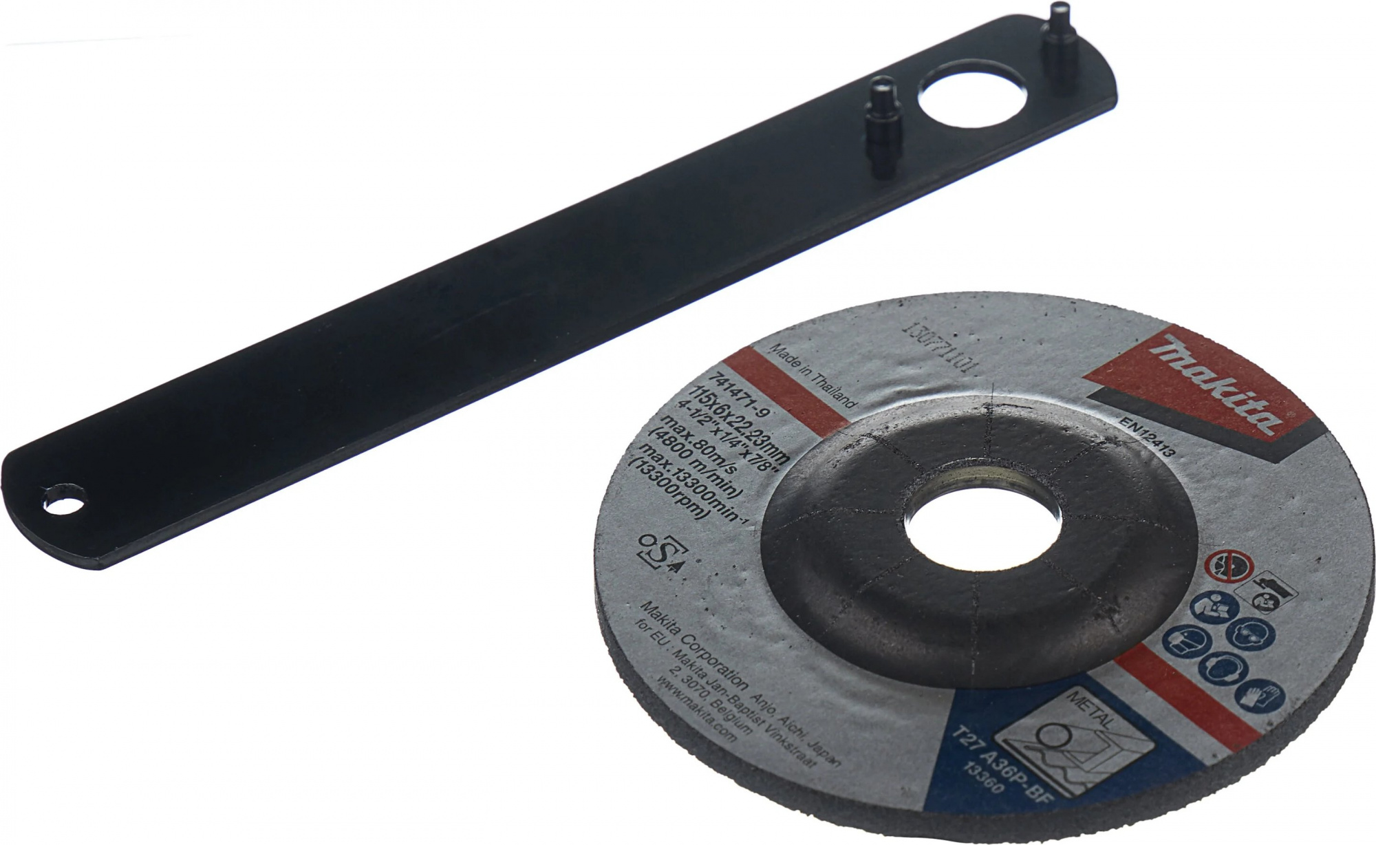 УШМ, защитный кожух, боковая рукоятка, зажимная гайка для дисков, фланец, для УШМ и штробореза, диск лепестковый 115х22 мм., инструкция, упаковка.