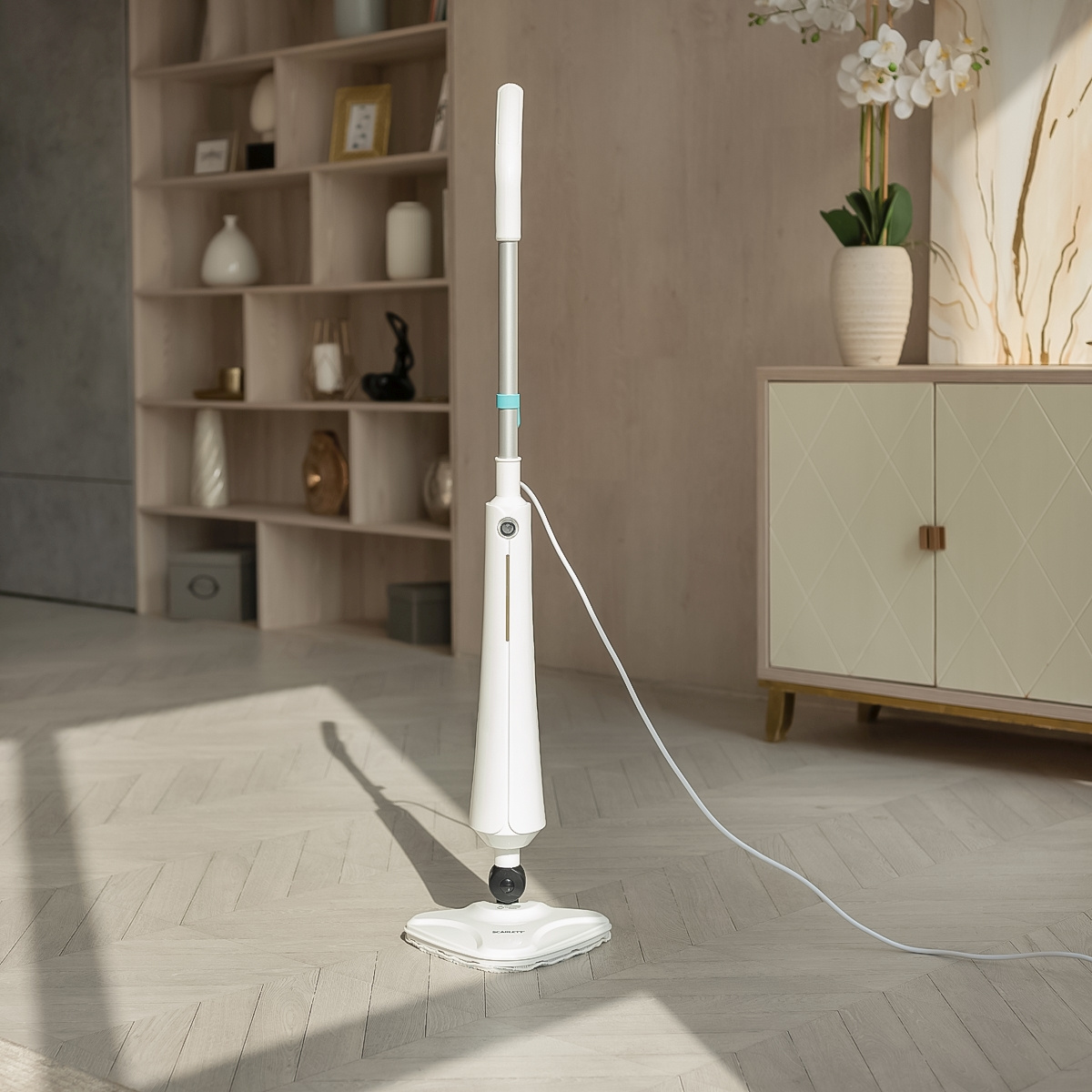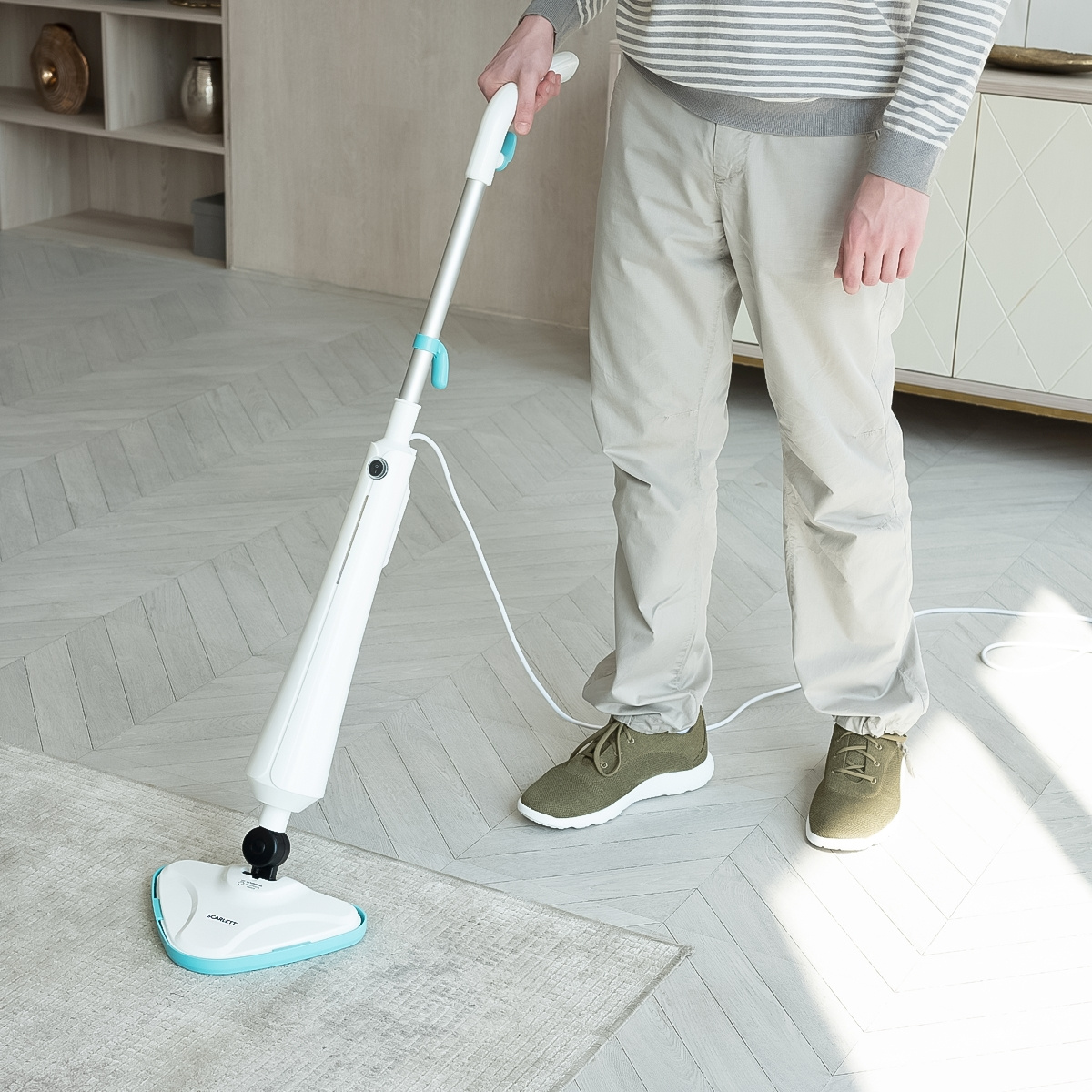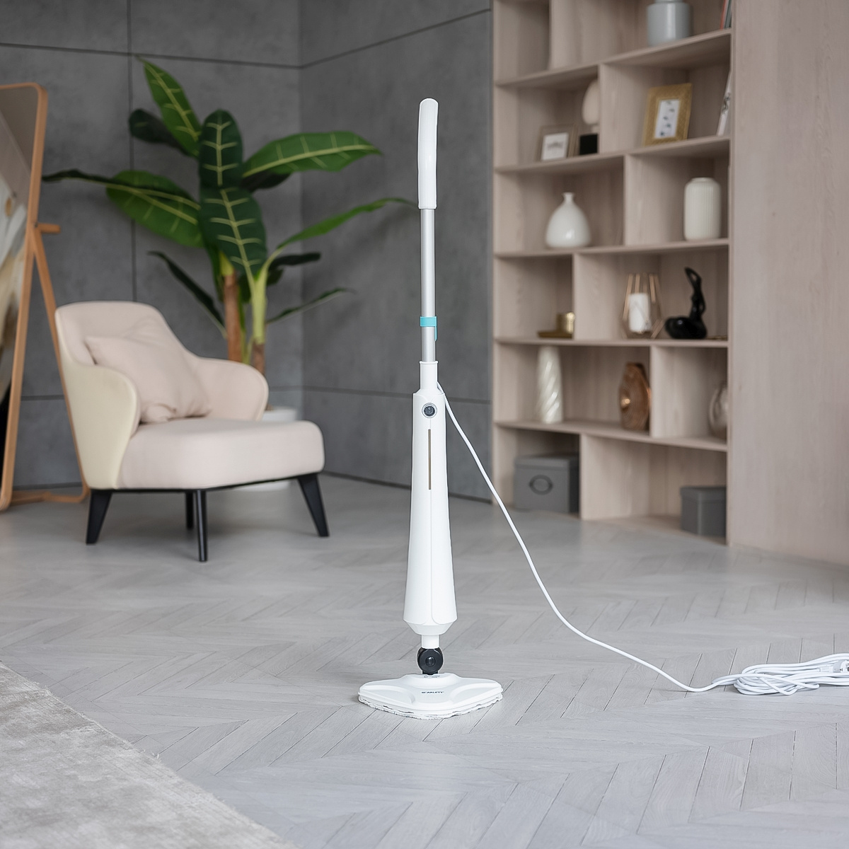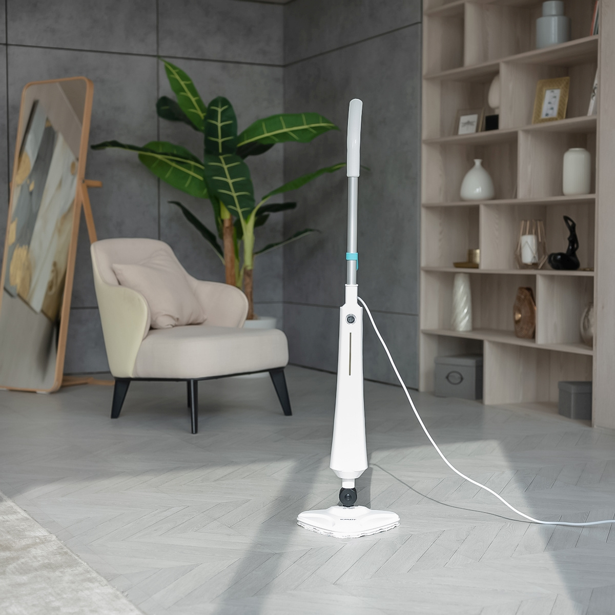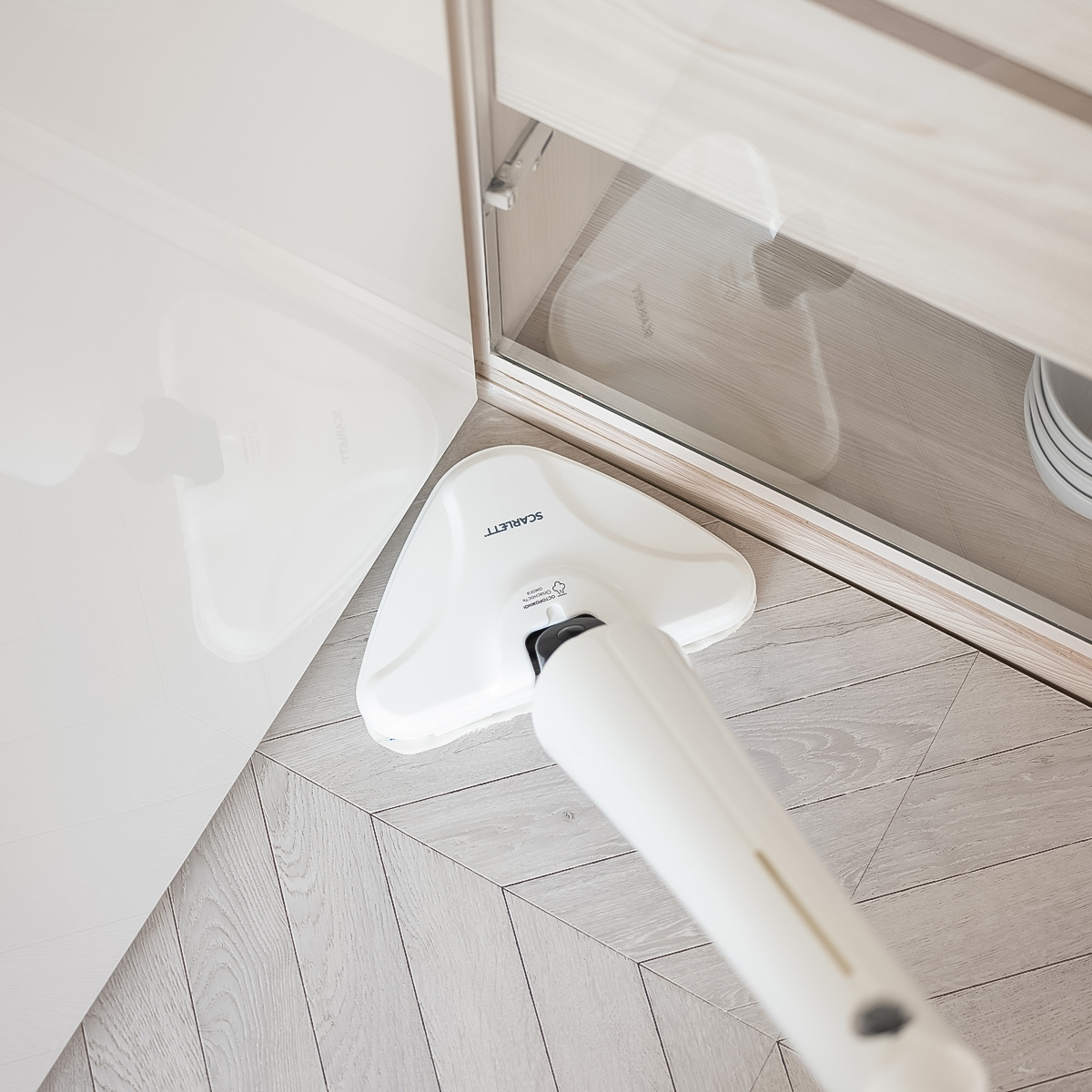 "Длинный шнур 7 метров. Увеличенная емкость бака для воды 350 мл. Легко очищает застарелые пятна. Подходит для уборки различных покрытий"