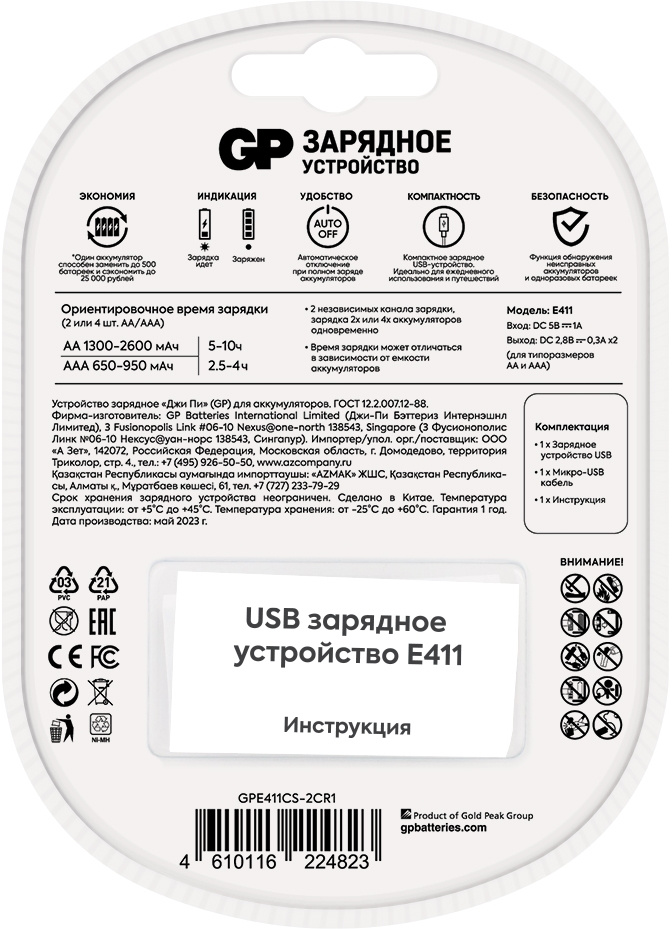 Универсальное зарядное устройство GP Е411CS-2CR1 на 4 слота способно заряжать одновременно 4 аккумулятора и работать с двумя форматами батарей – «пальцами» (AA) и «мизинцами» (AAA). Таким образом ваша техника, и гаджеты никогда не останутся без энергии. Время заряда: АА -5-10 ч., ААА - 2,5-4 ч.