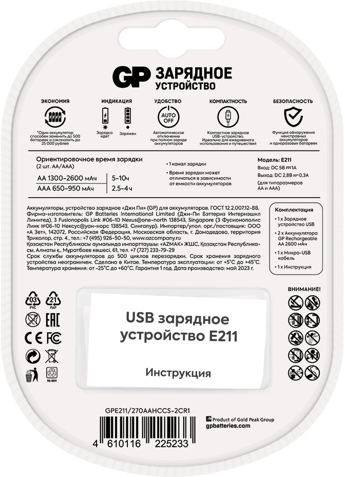 Новое зарядное устройство GP E211-270AAHCCS-2CR1 на 2 слота обеспечит аккумуляторам быструю зарядку. Устройство способно заряжать одновременно 2 батареи и рассчитано на 2 формата – АА и ААА. Время заряда: АА - 5-10 ч., ААА - 2,5-4 ч. Входящие в комплект элементы питания предварительно заряжены.