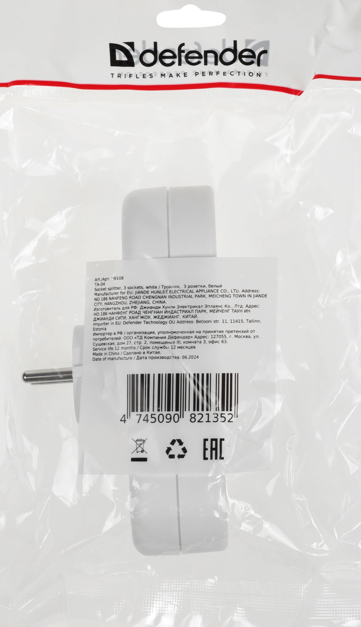 (3 розетки) белый (пакет ПЭ)