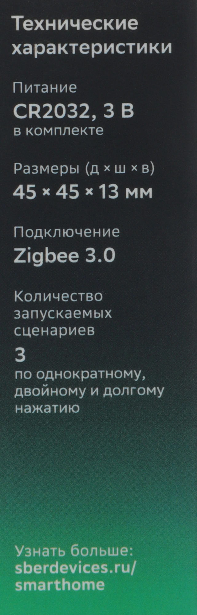 Умная кнопка Sber SBDV-00032 умеет выполнять простые действия или запускать целые сценарии. Для работы необходим центр управления умным домом - Хаб Sber (продается отдельно).