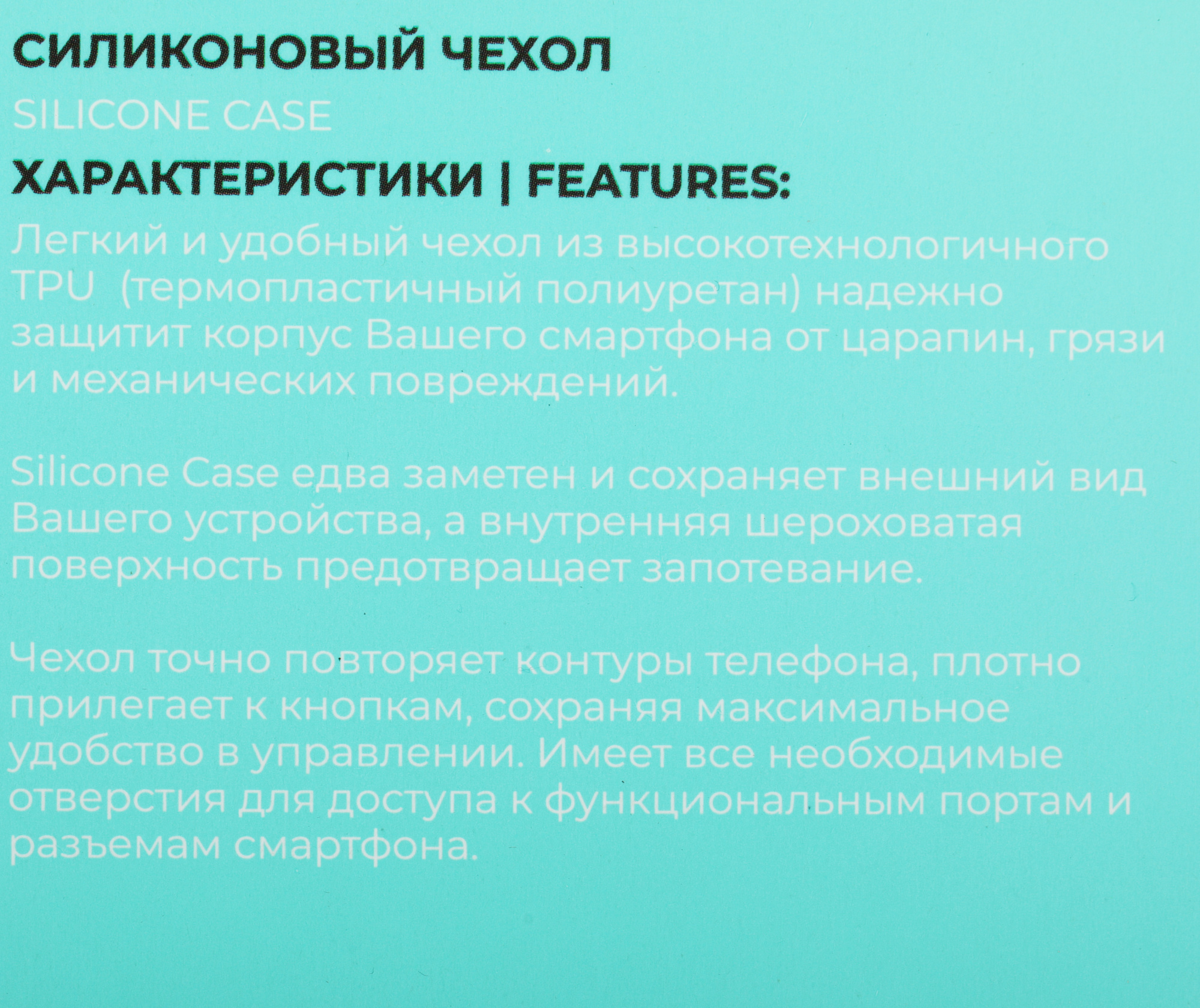 Чехол Silicone Case специально разработан с учётом всех особенностей Вашего смартфона. Благодаря толщине материала не более 0,8мм чехол минимально увеличивает размеры смартфона, при этом защищает заднюю панель от царапин, грязи и пыли, а матовая поверхность предотвращает выскальзывание из рук.