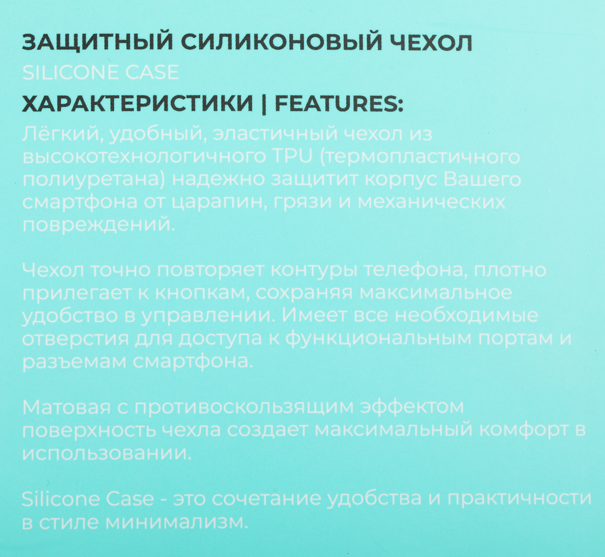 Чехол Silicone Case специально разработан с учётом всех особенностей Вашего смартфона. Благодаря толщине материала не более 0,8мм чехол минимально увеличивает размеры смартфона, при этом защищает заднюю панель от царапин, грязи и пыли, а матовая поверхность предотвращает выскальзывание из рук.
