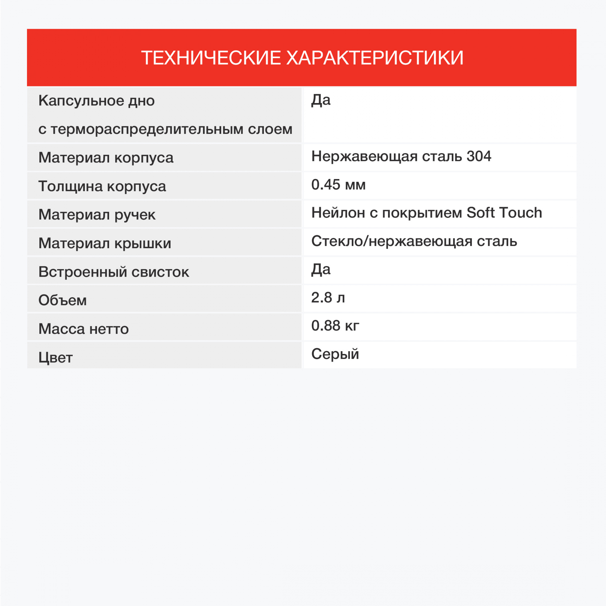 Чайник из нержавеющей стали Starwind Chef Daily удачно сочетает в себе практичность, привлекательный внешний и вид и функциональность. Он прост в уходе и эксплуатации, не требует использования прихваток и постоянного наблюдения за процессом кипячения, благодаря встроенному свистку. Прозрачная крышка позволит быстро оценить уровень воды и отключить нагрев до достижения температуры кипения после начала образования мелких пузырьков.