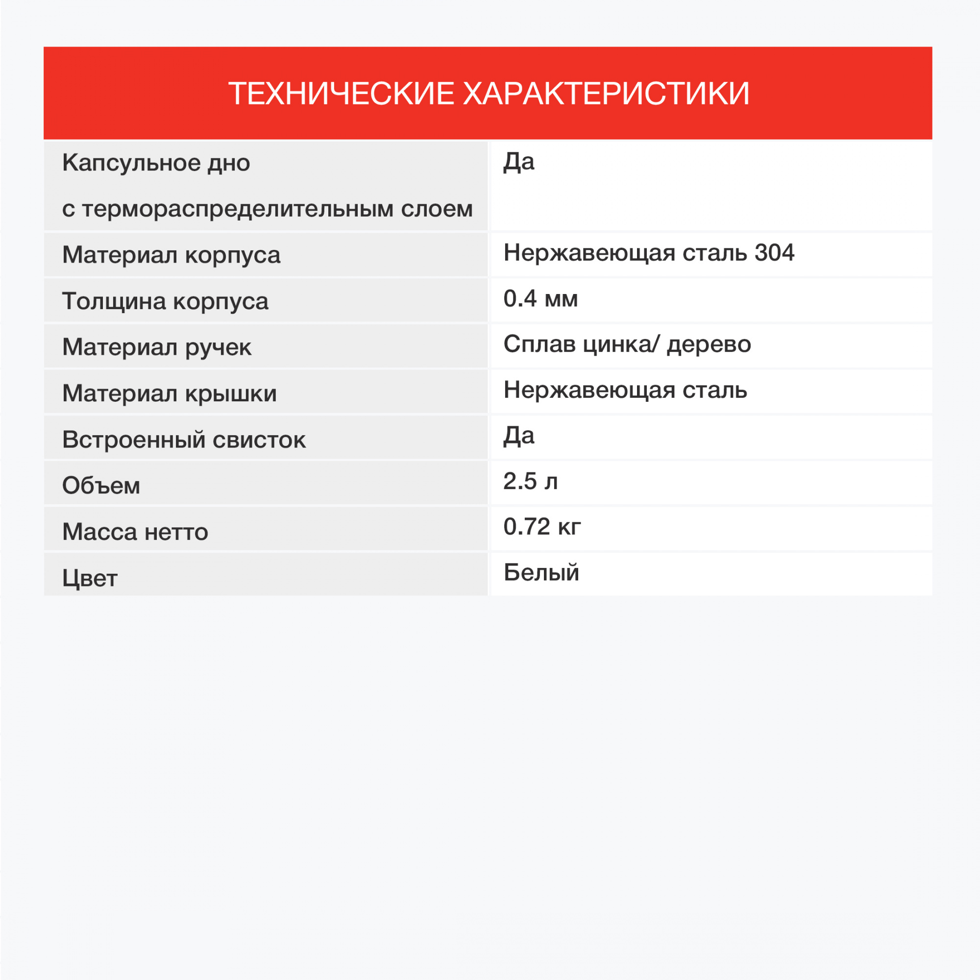 Белый металлический чайник со свистком Starwind Chef Country не только быстро вскипятит воду, но и своевременно оповестит о завершении этого процесса. Прочный и надежный корпус из нержавеющей стали рассчитан на продолжительную интенсивную эксплуатацию. Полезный объем чайника 2,5 л позволит приготовить до 10 порций горячего напитка за один прием.