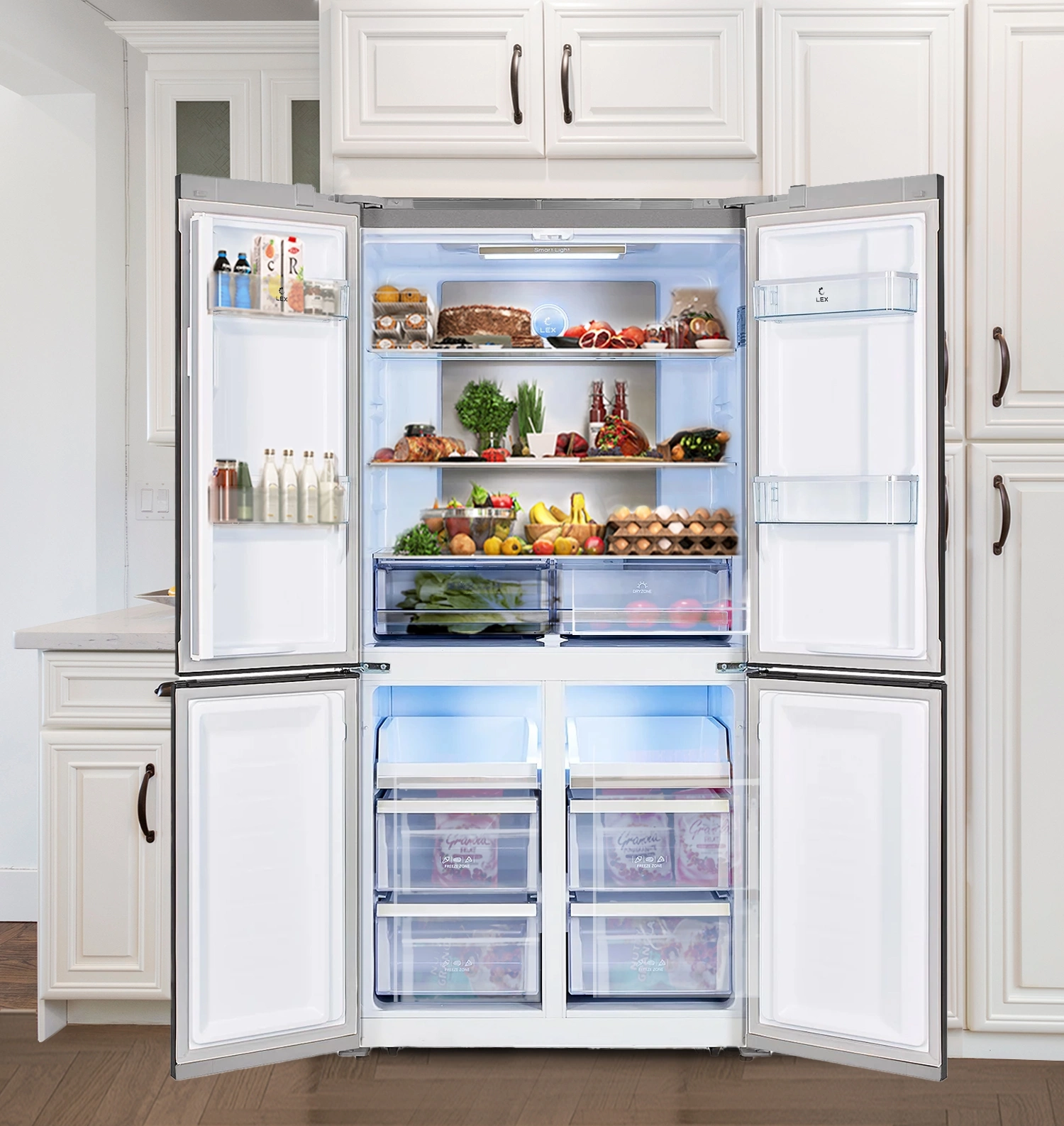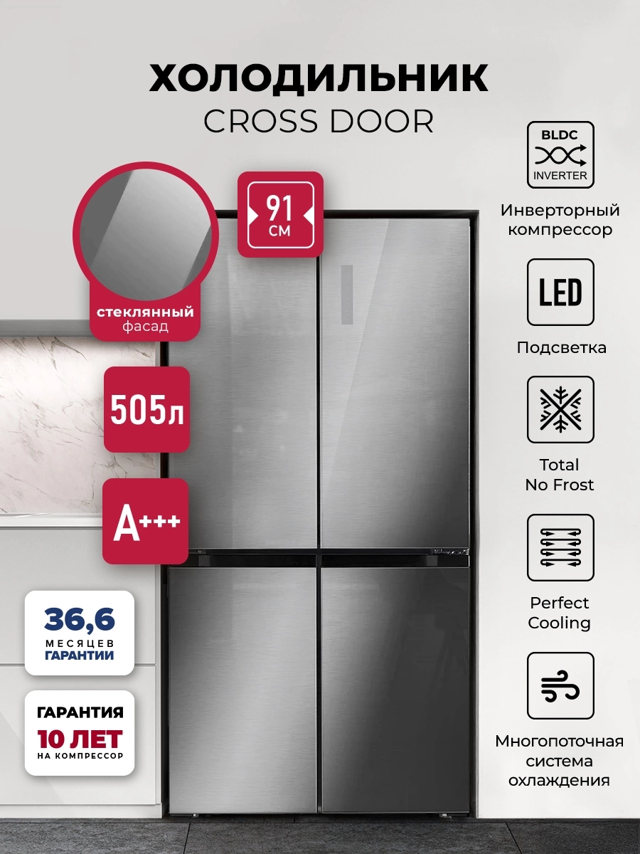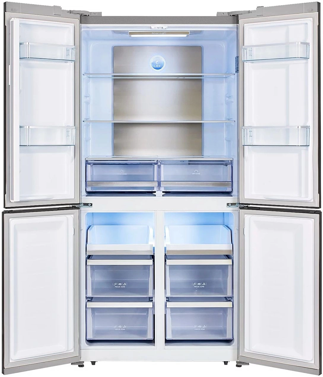 Модель типа CROSS DOOR имеет верхнее холодильное и два независимых нижних морозильных отделения.