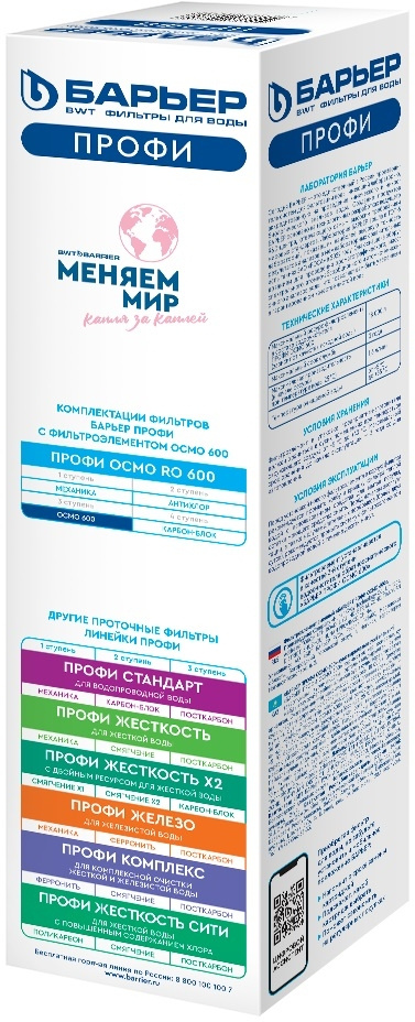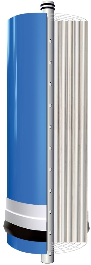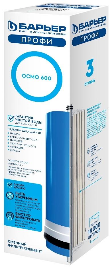 Обратноосмотическая мембрана очищает воду от примесей на молекулярном уровне. Пропускает только молекулы воды, задерживая бактерии и вирусы, соли жесткости, нитраты, нитриты, фториды, тяжелые металлы. Рекомендуемая частота замены - 36 мес (зависит от качества исходной воды).