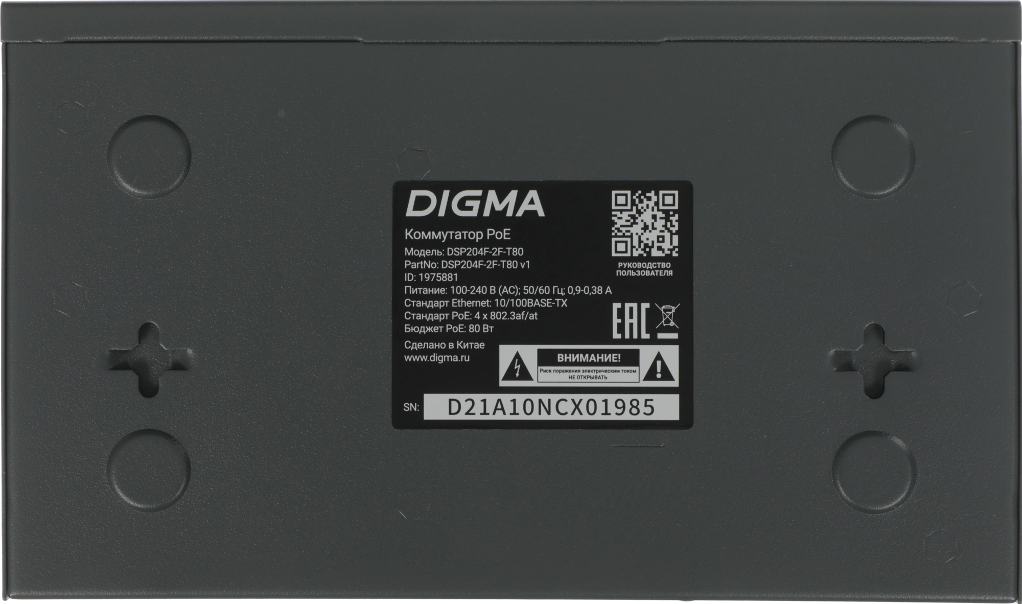 Digma DSP204F-2F-T80 - это PoE коммутатор, предназначенный для работы в небольших сетях совместно с сетевым оборудованием, таким как IP видеокамеры, IP-телефоны и другими устройствами с поддержкой питания стандарта PoE.