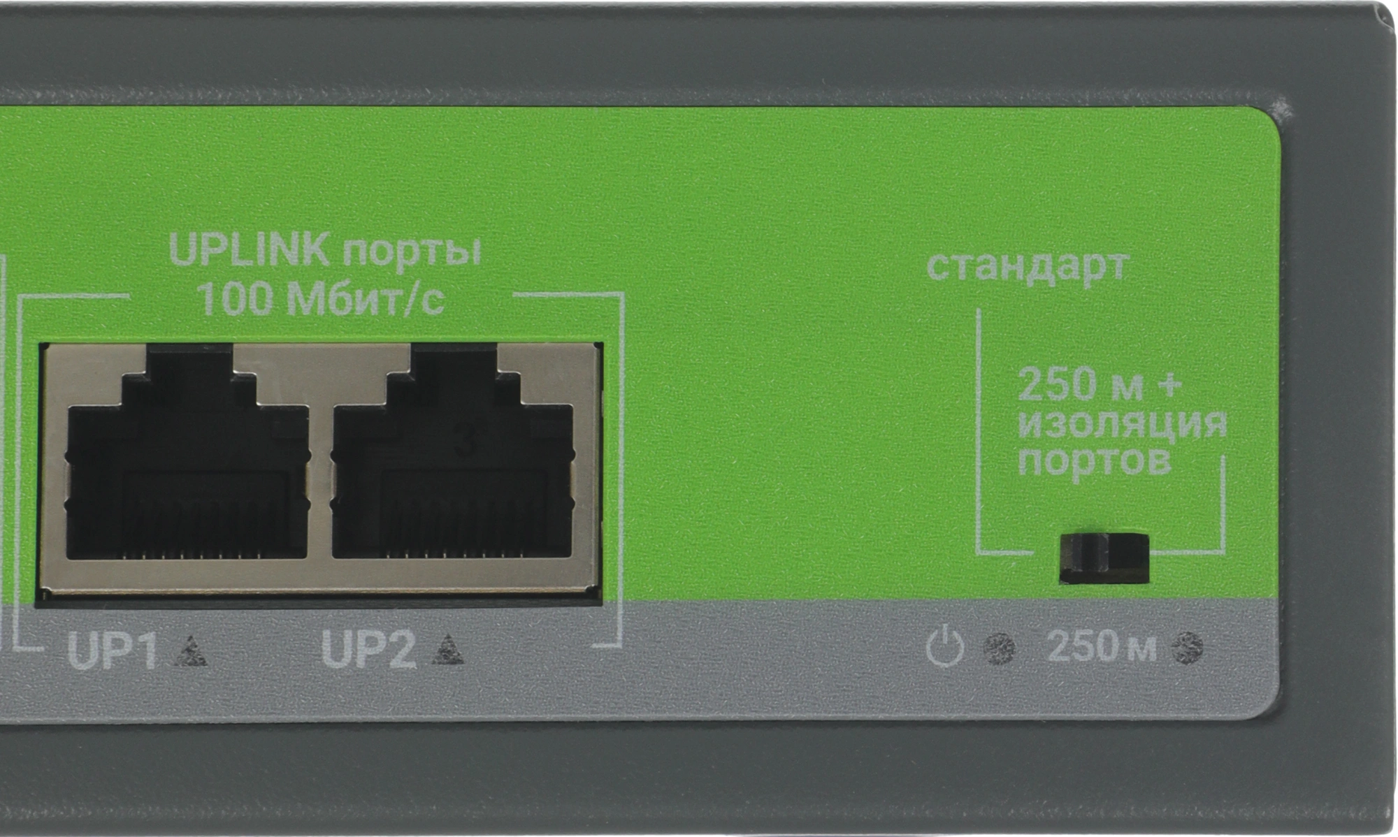 Модель также оборудована двумя портами UPLINK (2 х 100 Мбит/с), предназначенными для каскадного соединения коммутаторов и подключения серверов, роутеров и видеорегистраторов NVR.
