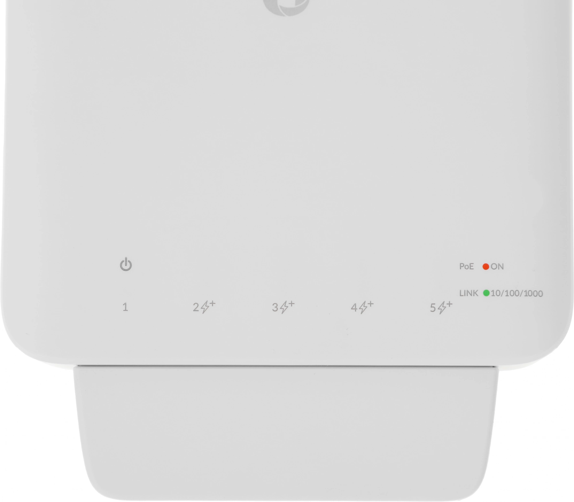 Поддержка PoE 802.3af - со 2-го по 5-й порт (выходы), порт #1 - вход с поддержкой входа PoE 802.3bt для подачи питания на коммутатор. Раб.температура - от -40 до +55C при 95% влажности без конденсации.