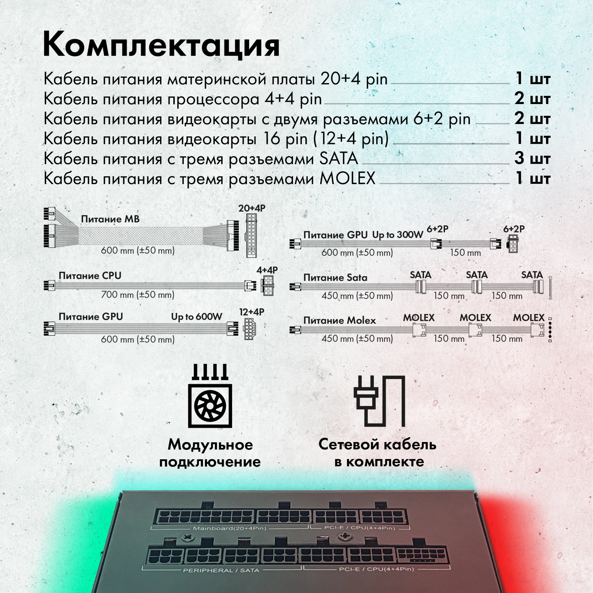 Модульное подсоединение кабелей. Возможность подключения только необходимых линий питания позволяет добиться идеального кабель-менеджмента при сборке ПК и способствует эффективному охлаждению компонентов за счет беспрепятственной циркуляции воздуха внутри системного блока.