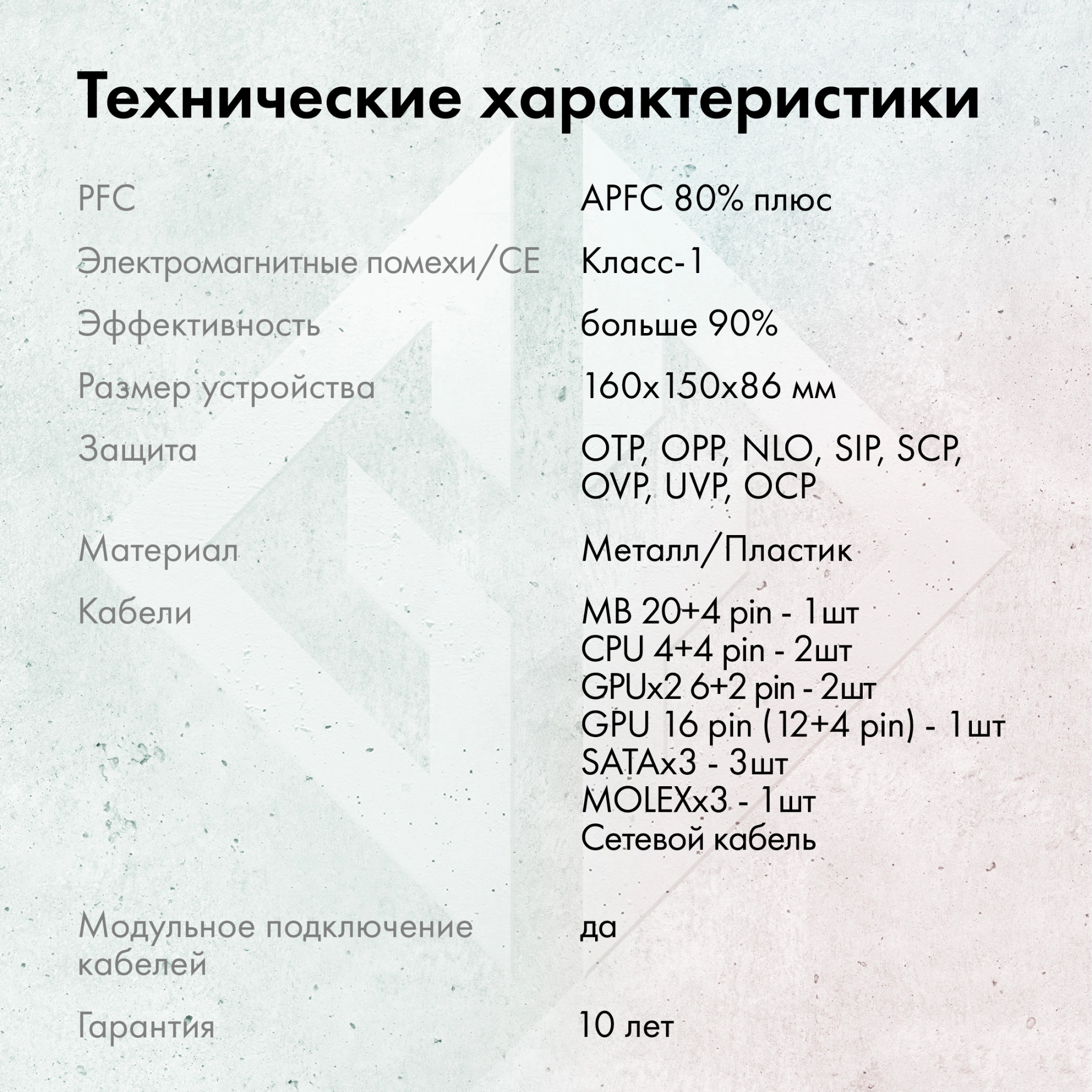 Поддержка стандарта ATX 3.0. Гарантирует совместимость с новейшими видеокартами за счет наличия разъема 12+4-pin и возможности передачи необходимой им повышенной мощности до 600 Вт, а также обмена данными об установленных компонентах для определения оптимального режима работы блока питания.