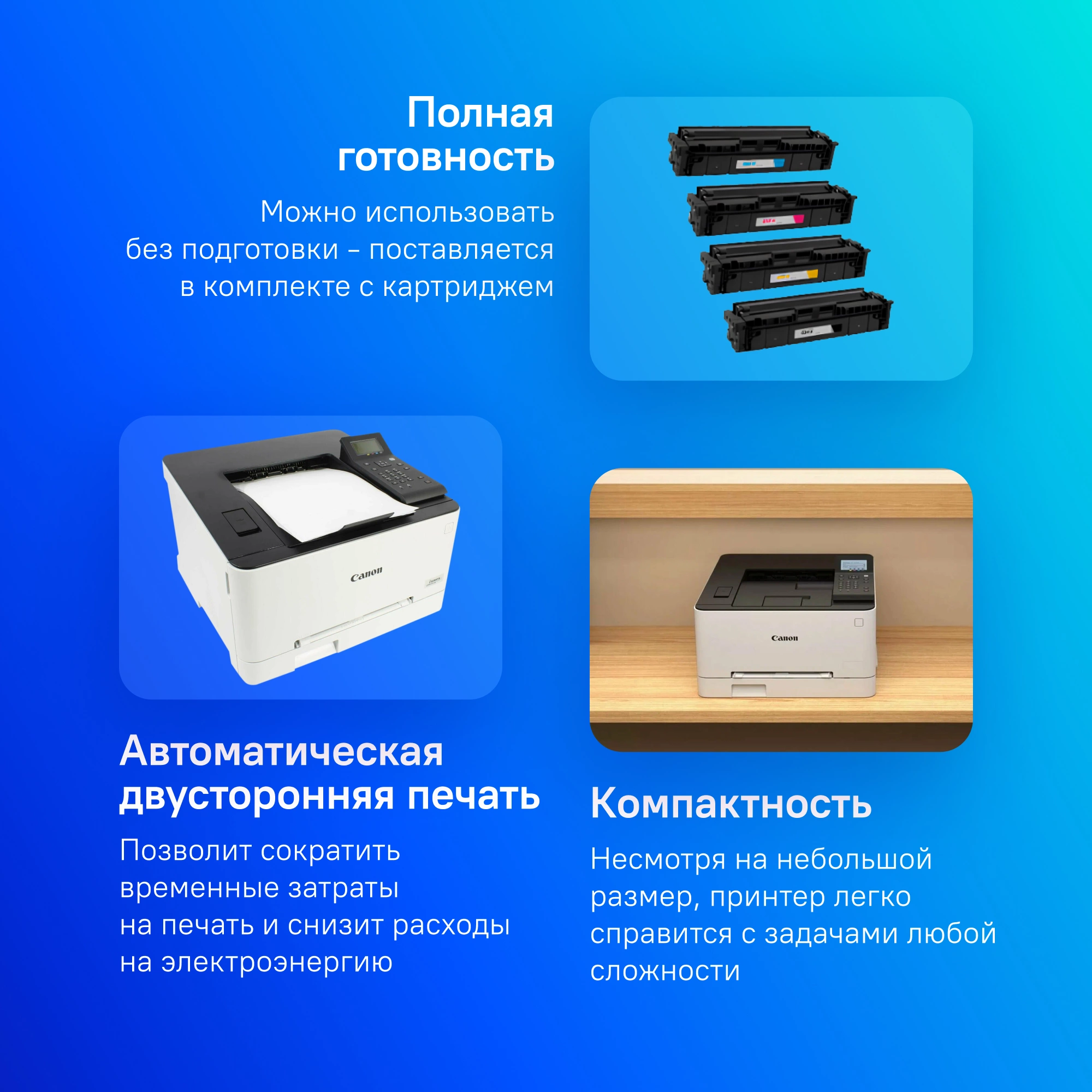 В комплект поставки принтера входят стартовые картриджи: черный — 910 страниц, (C/M/Y) — 680 страниц.