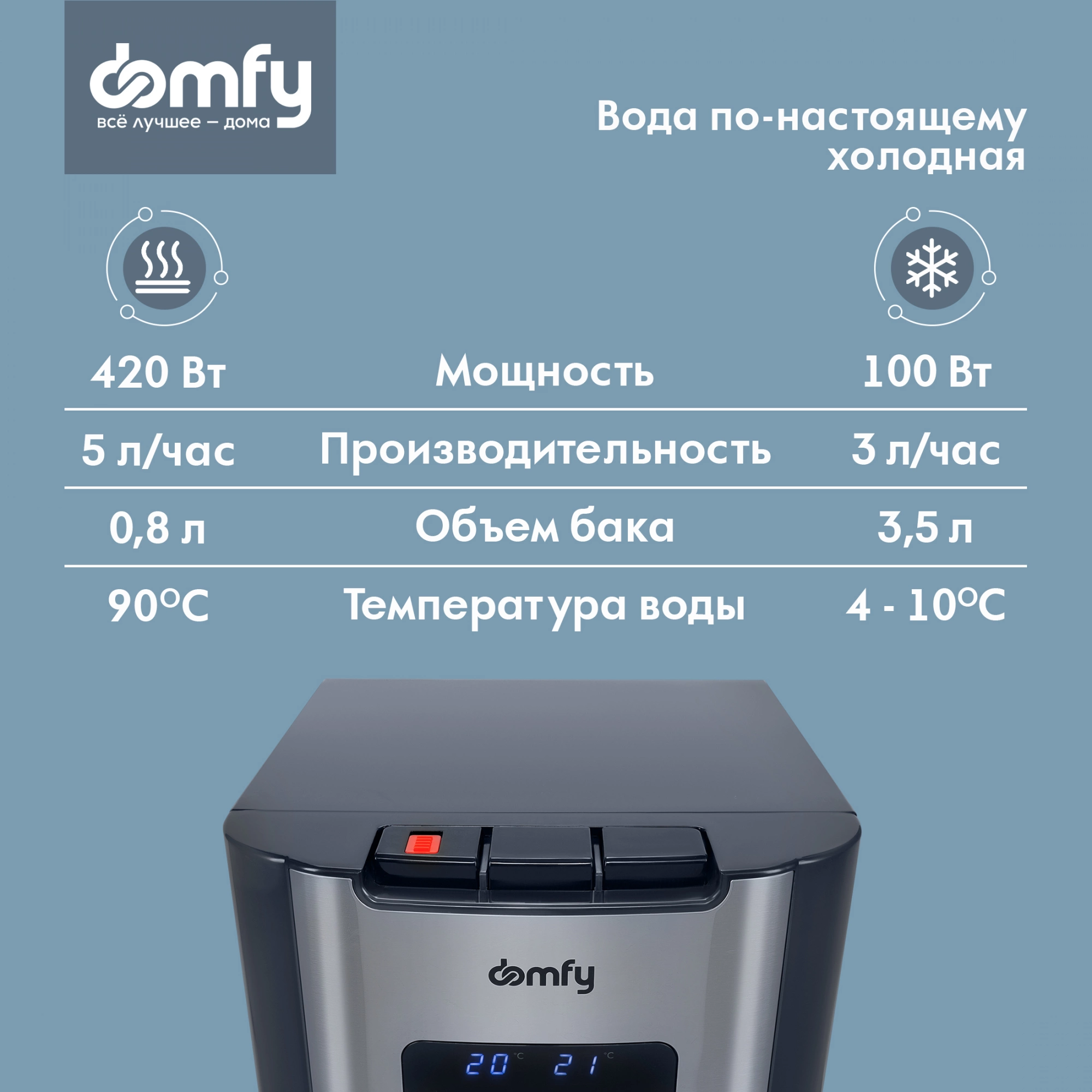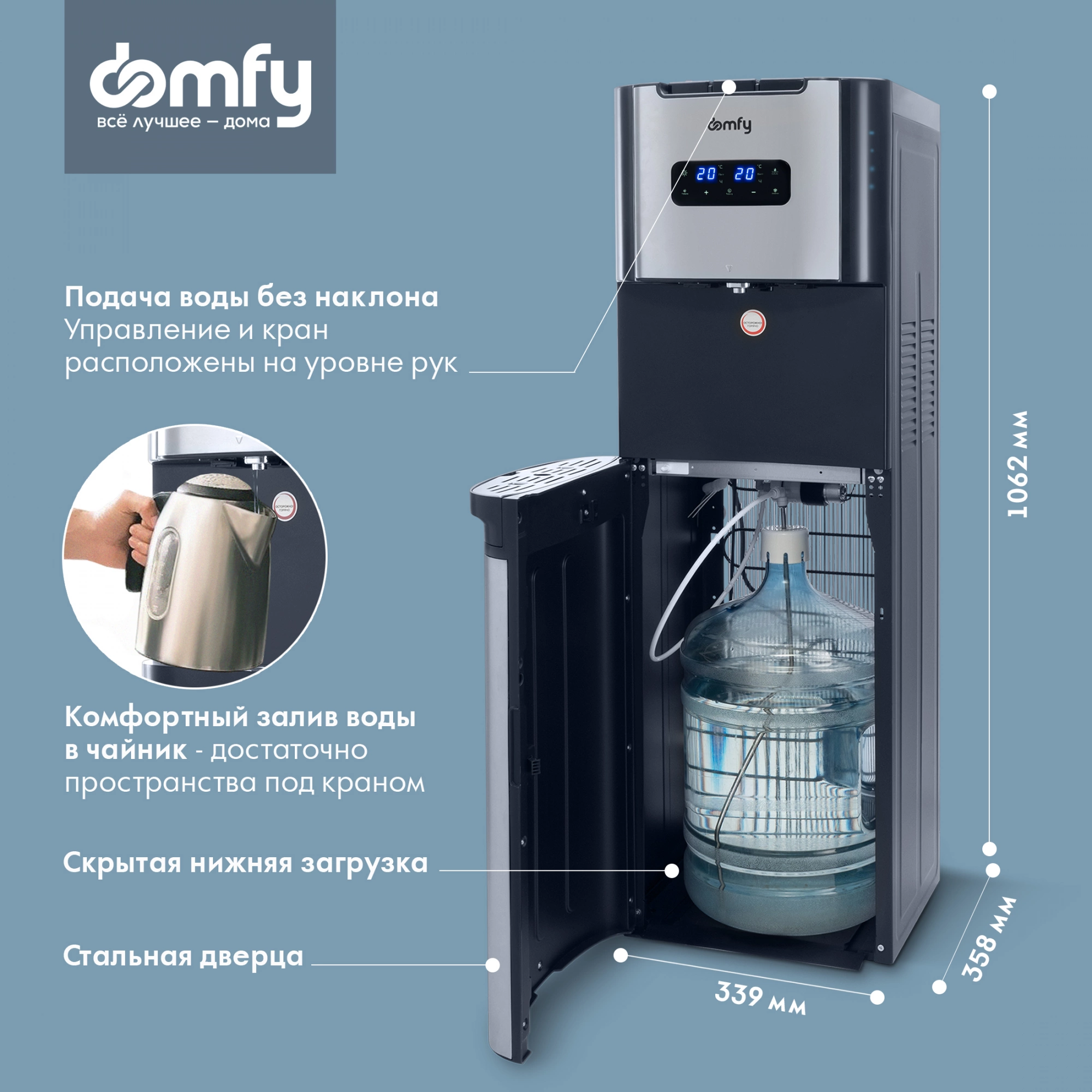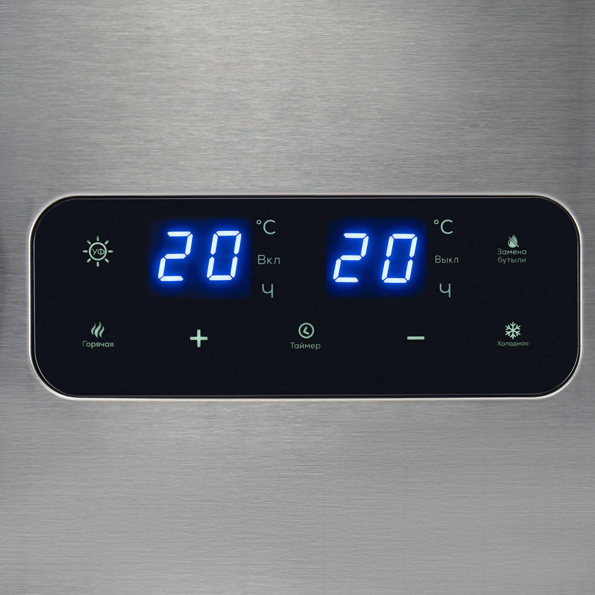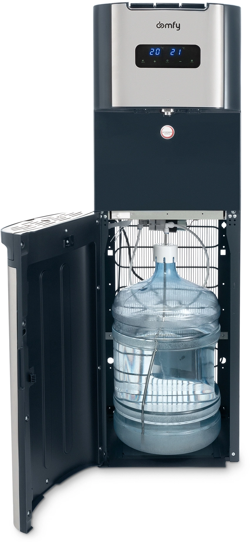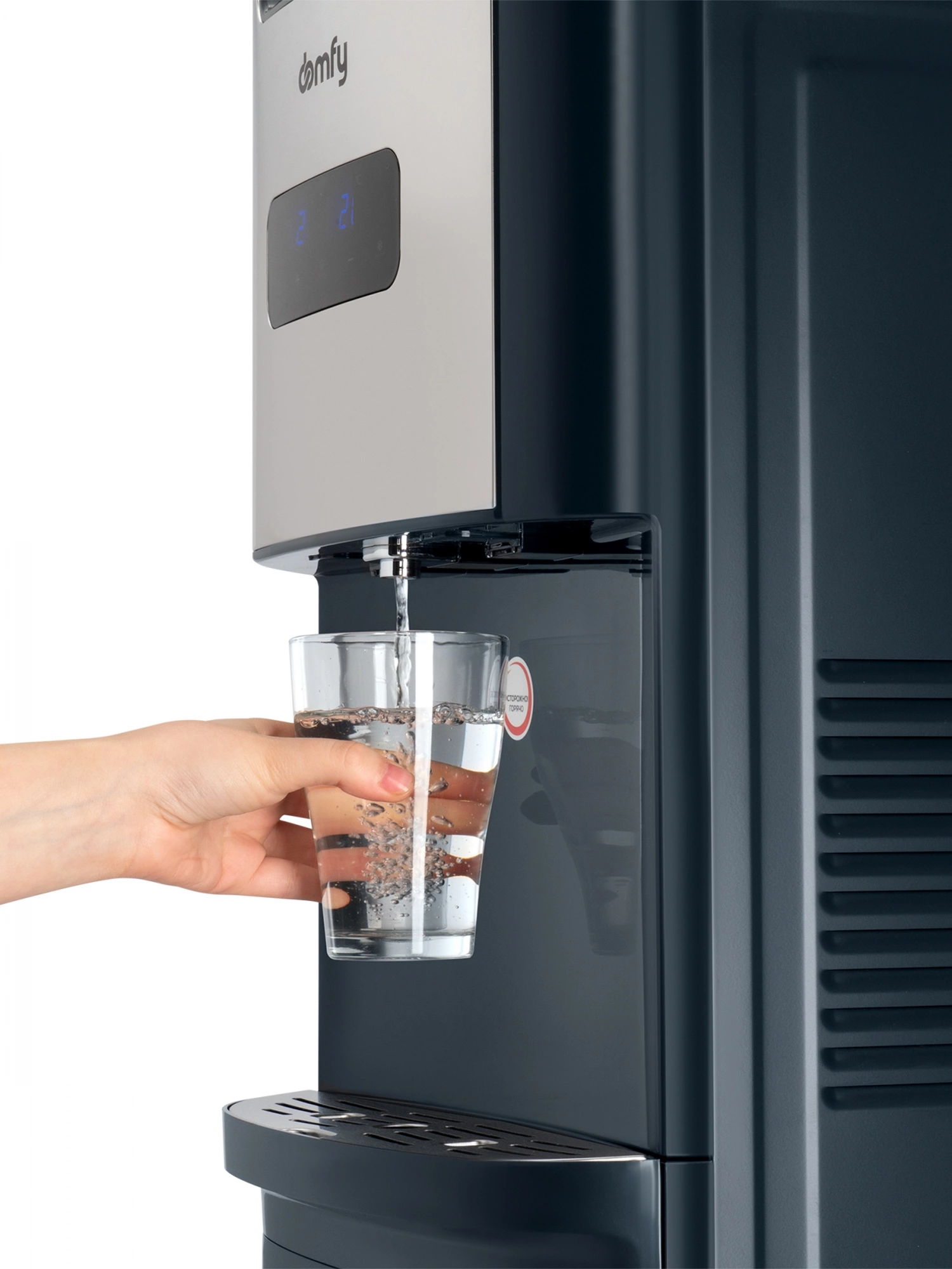 Компактность и стиль. Графитовый цвет, металлическая дверца отсека для бутыли и современный дизайн кулера делают его идеальным дополнением к любому интерьеру, будь то домашняя кухня или офисное пространство. Размеры прибора 1062 х 358 х 339 мм позволяют оптимально использовать пространство без потери в функциональности.
