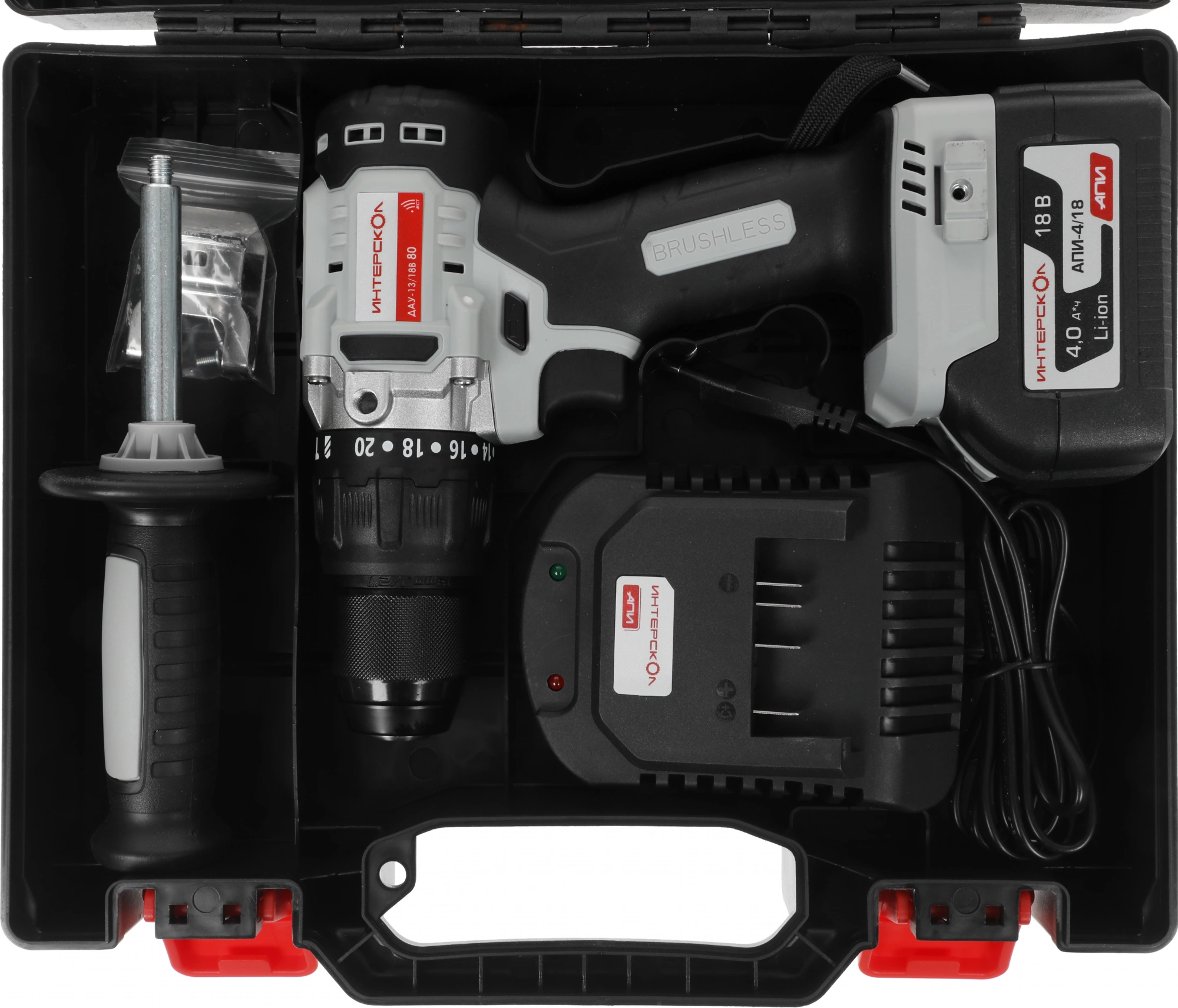 Машина ручная сверлильная аккумуляторная, патрон сверлильный БЗП, инструкция по безопасности и руководство по эксплуатации, гарантийный талон, батарея аккумуляторная 4 Ач, зарядное устройство, кейс пластиковый, дополнительная рукоятка.
