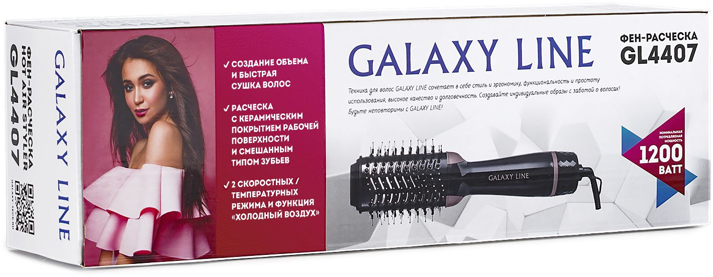 Фен-расческа GALAXY LINE GL4407 - современный и функциональный прибор для быстрой сушки волос, создания объема и неповторимой укладки. Высокая мощность 1200 Вт гарантирует быстрый нагрев прибора.