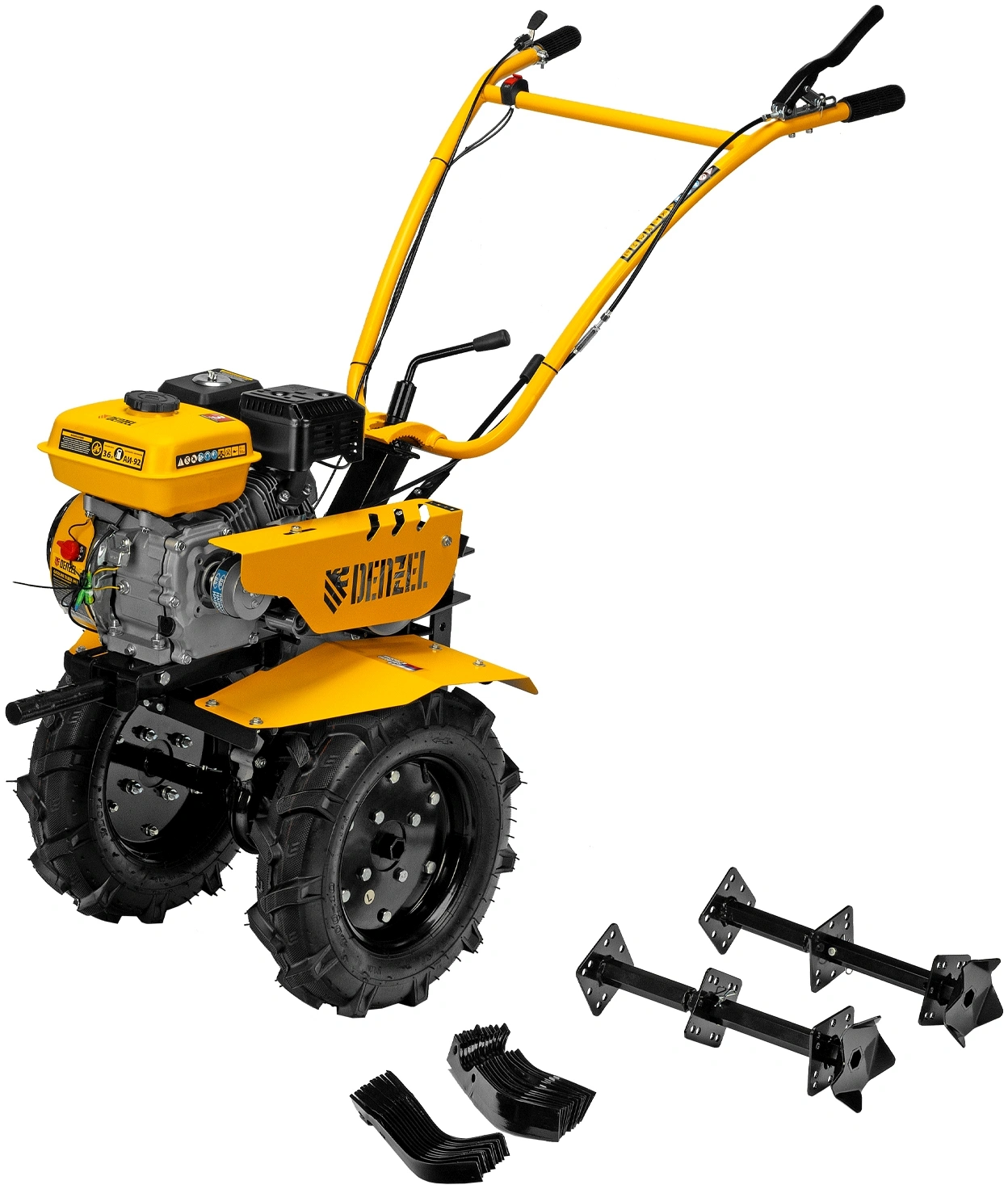 Мотоблок, Колесо - 2, Ось крепления колеса - 2, Комплект фрез, Комплект осей для крепления фрез, Сошник, Сцепка сошника, Рукоятка транспортировочная, Крыло защитное - 2, Передняя соединительная планка крыльев - 2, Задняя соединительная планка крыльев, Рычаг переключения передач, Фиксатор руля,Крепеж