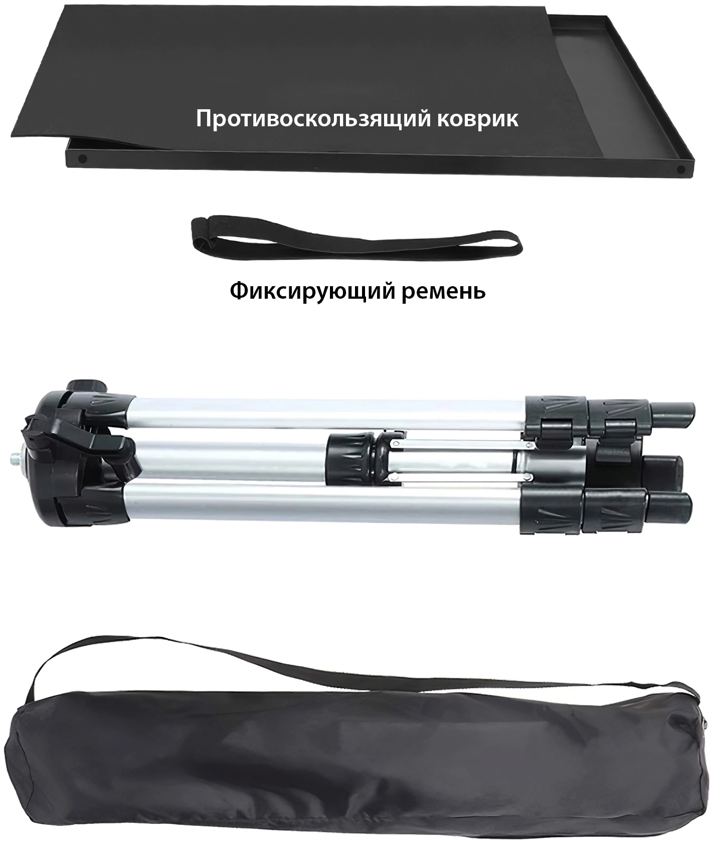 Размеры столика штатива составляют 380 х 280 см, что обеспечивает достаточное пространство для установки устройства подходящего размера. Материал ножек – алюминий, что не только говорит о прочности изделия, но и придает ему элегантный и стильный вид.