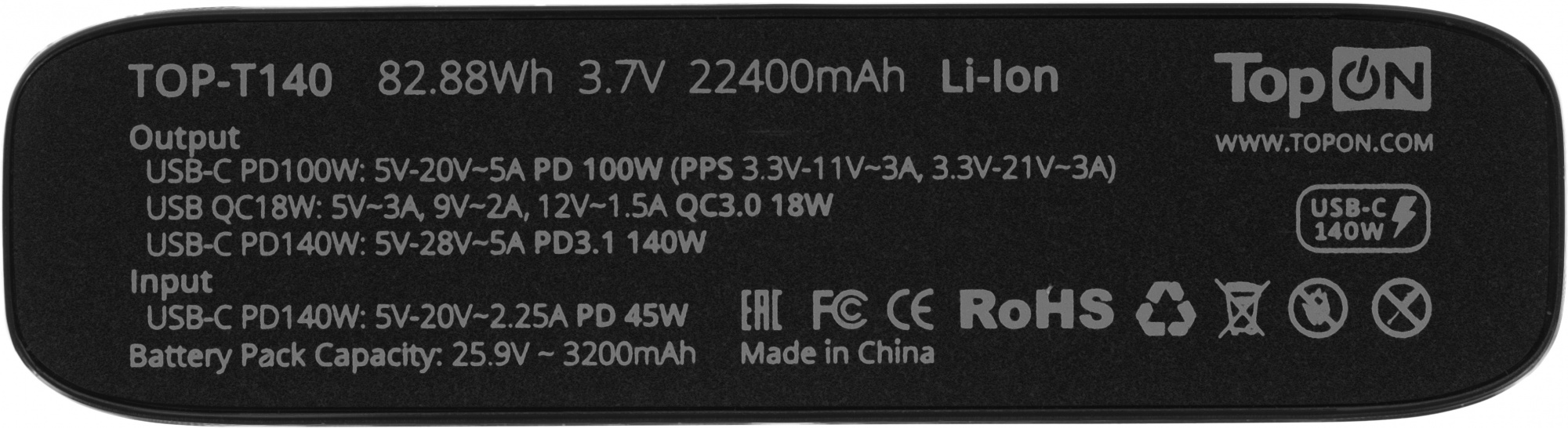 Внешний аккумулятор TopON TOP-T140 для зарядки ноутбуков, смартфонов и другой цифровой техники. USB-C PD100W: 5V-20V~5A PD 100W (PPS 3.3V-11V~3A, 3.3V-21V~3A).