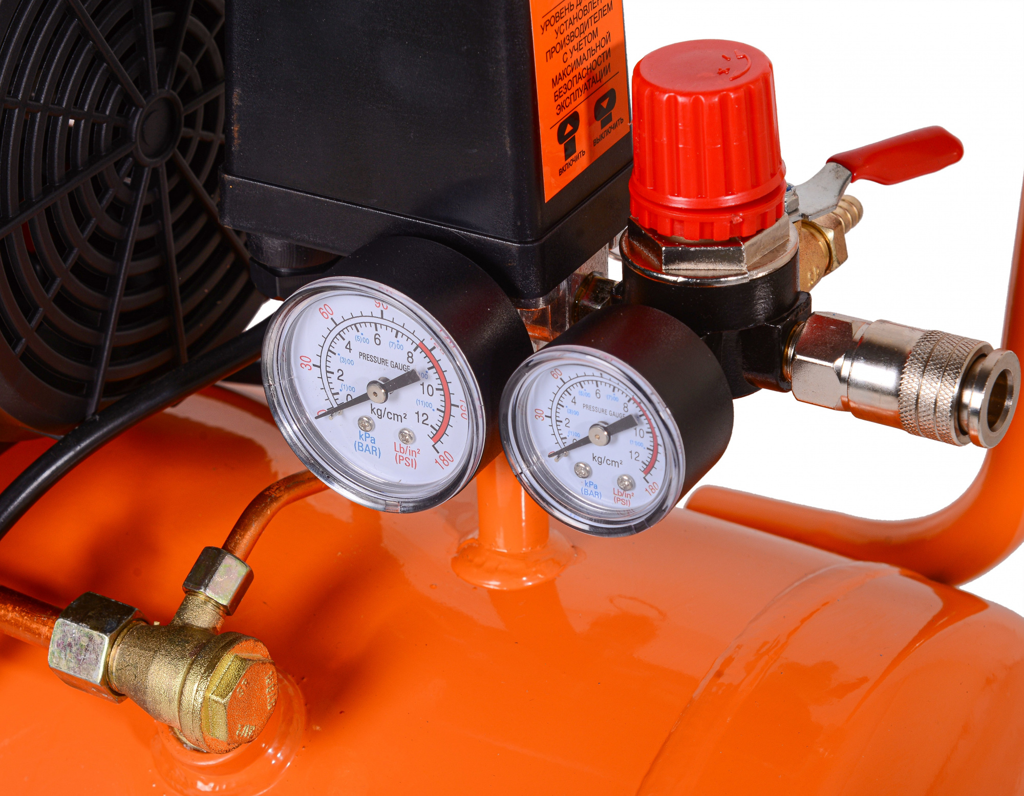 Низкий уровень шума; не требует замены масла; чистый воздух, без примесей масла; эффективное туннельное охлаждение; удобная ручка; регулятор давления; предохранительный клапан; манометр выходного давления.