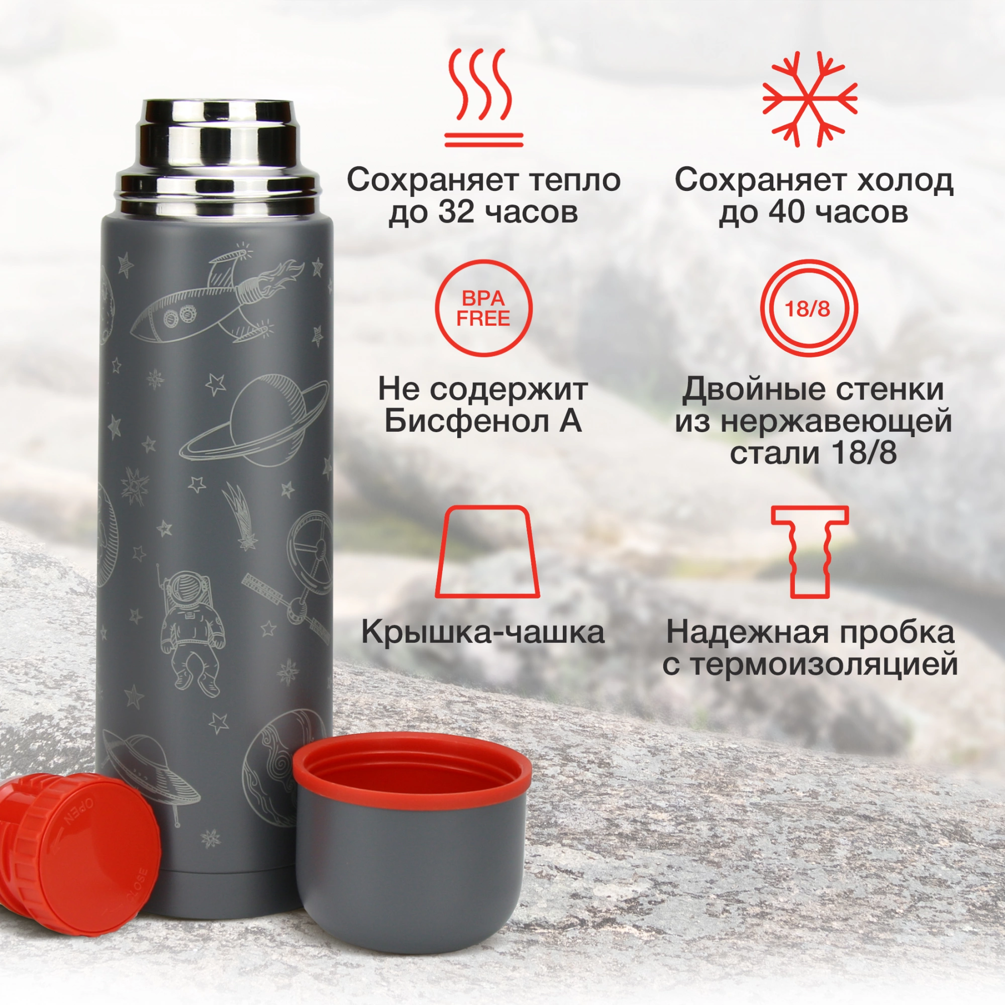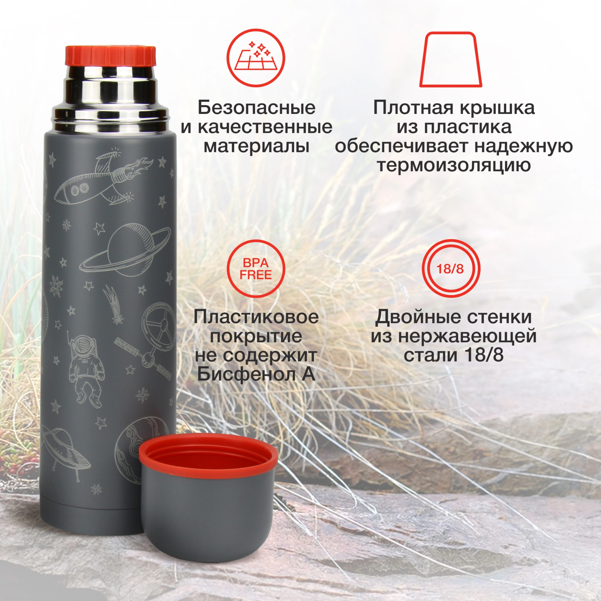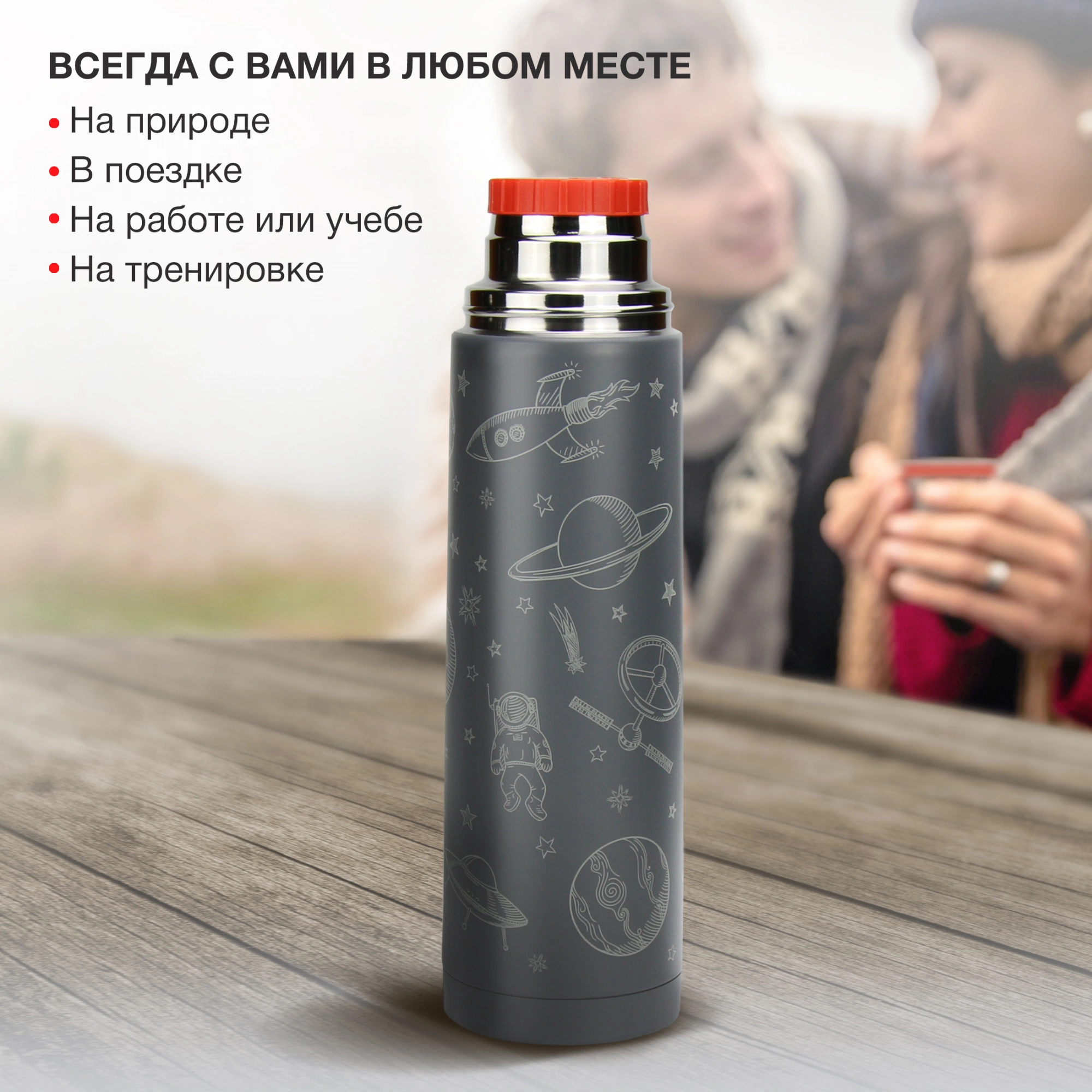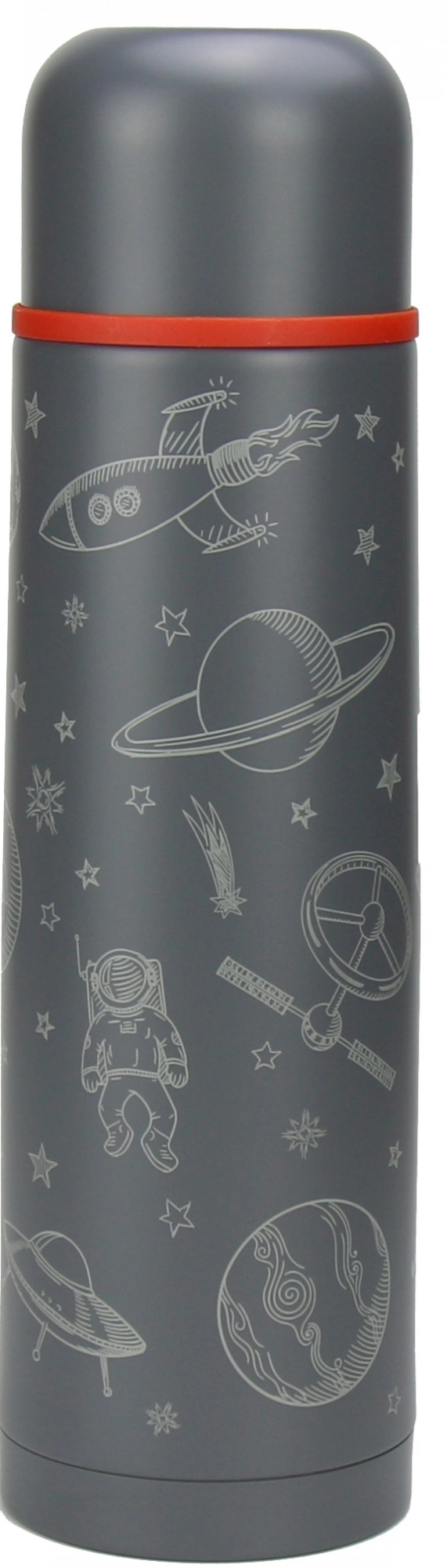 Стильный дизайн. Термос выглядит современно и привлекает внимание серебристо-серым принтом на космическую тематику.