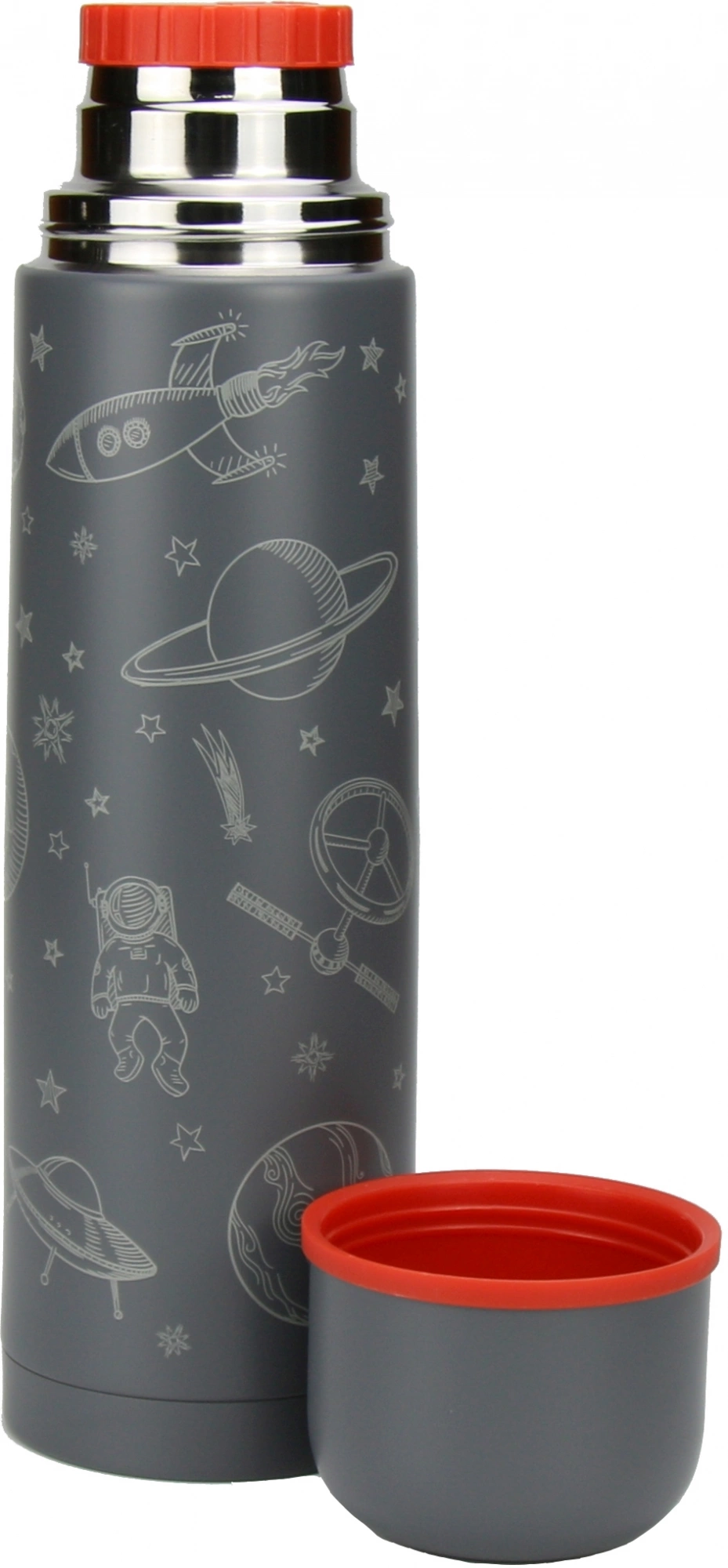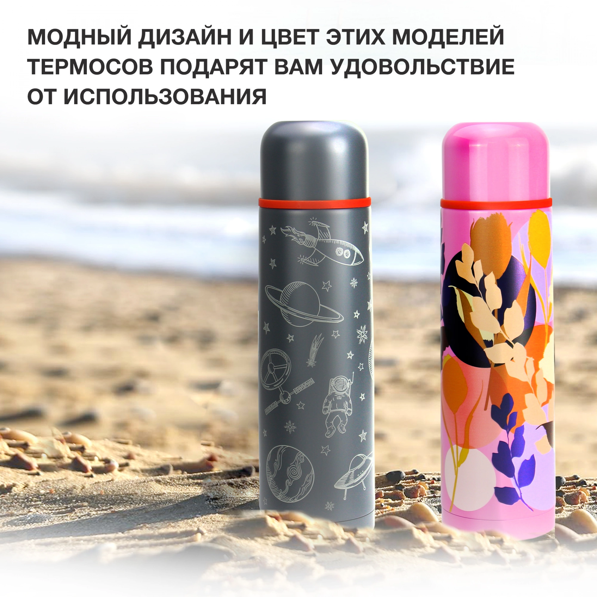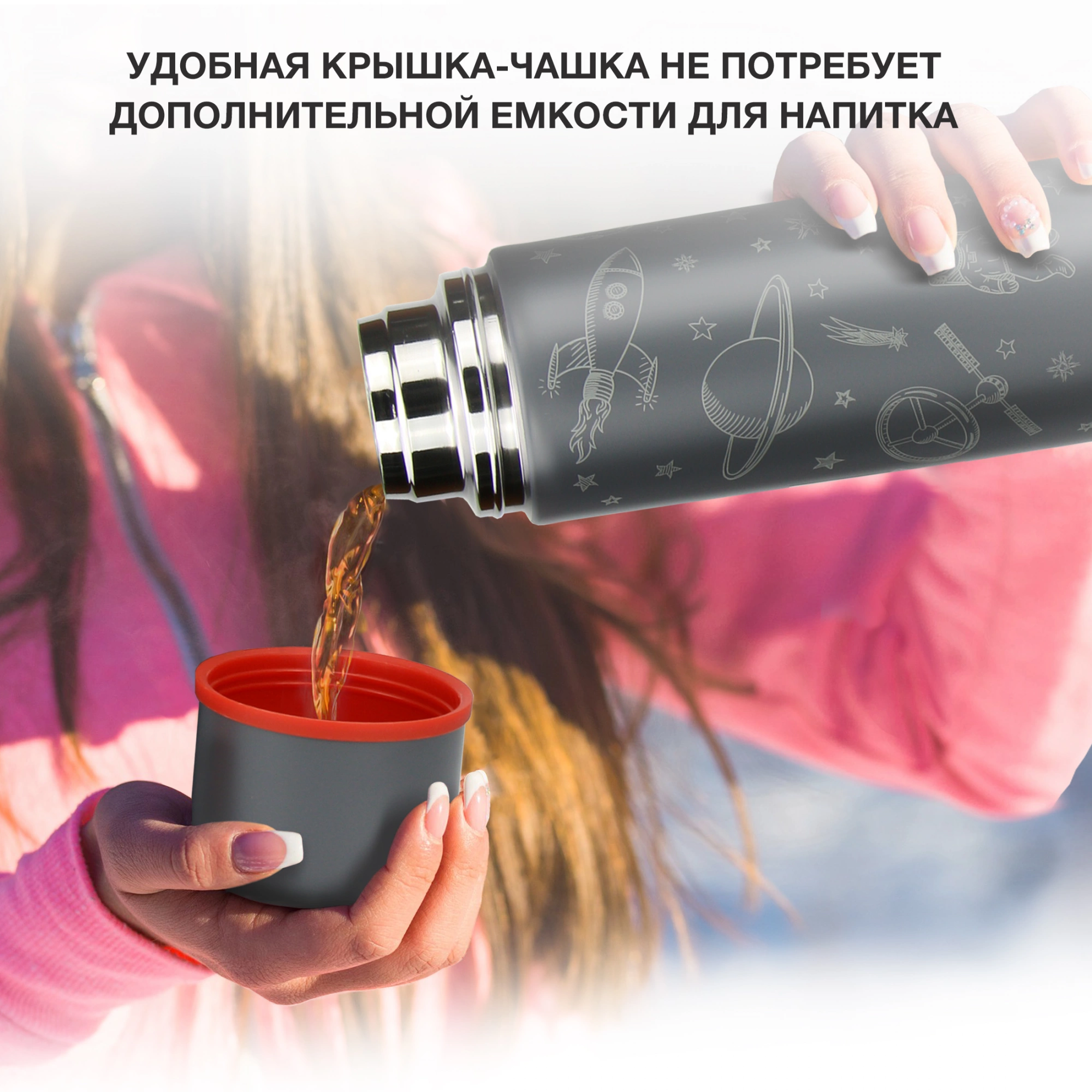 Стильный дизайн. Термос выглядит современно и привлекает внимание серебристо-серым принтом на космическую тематику.