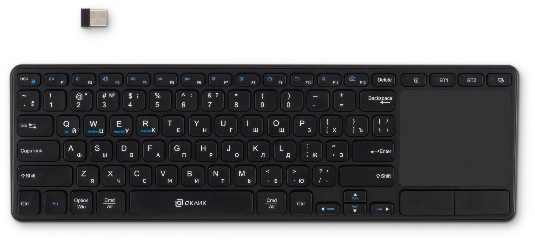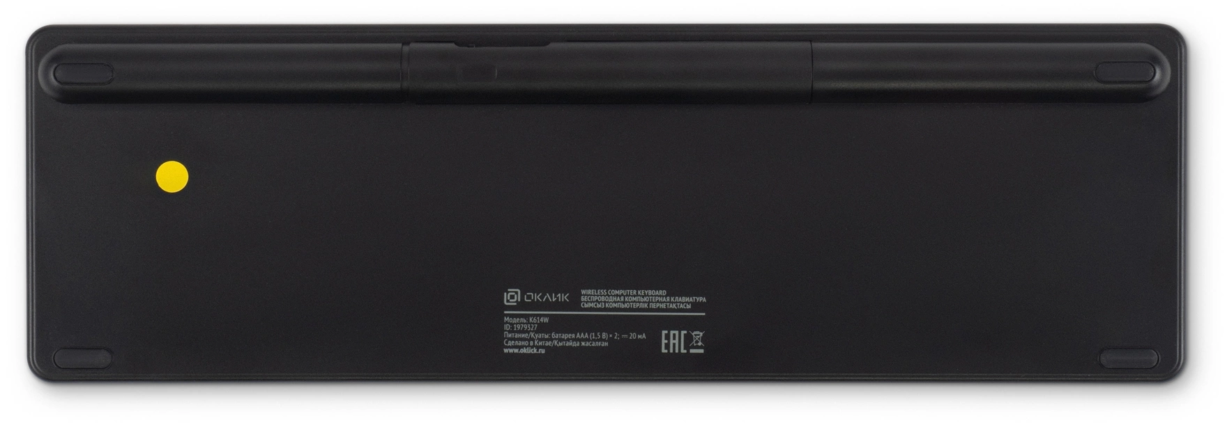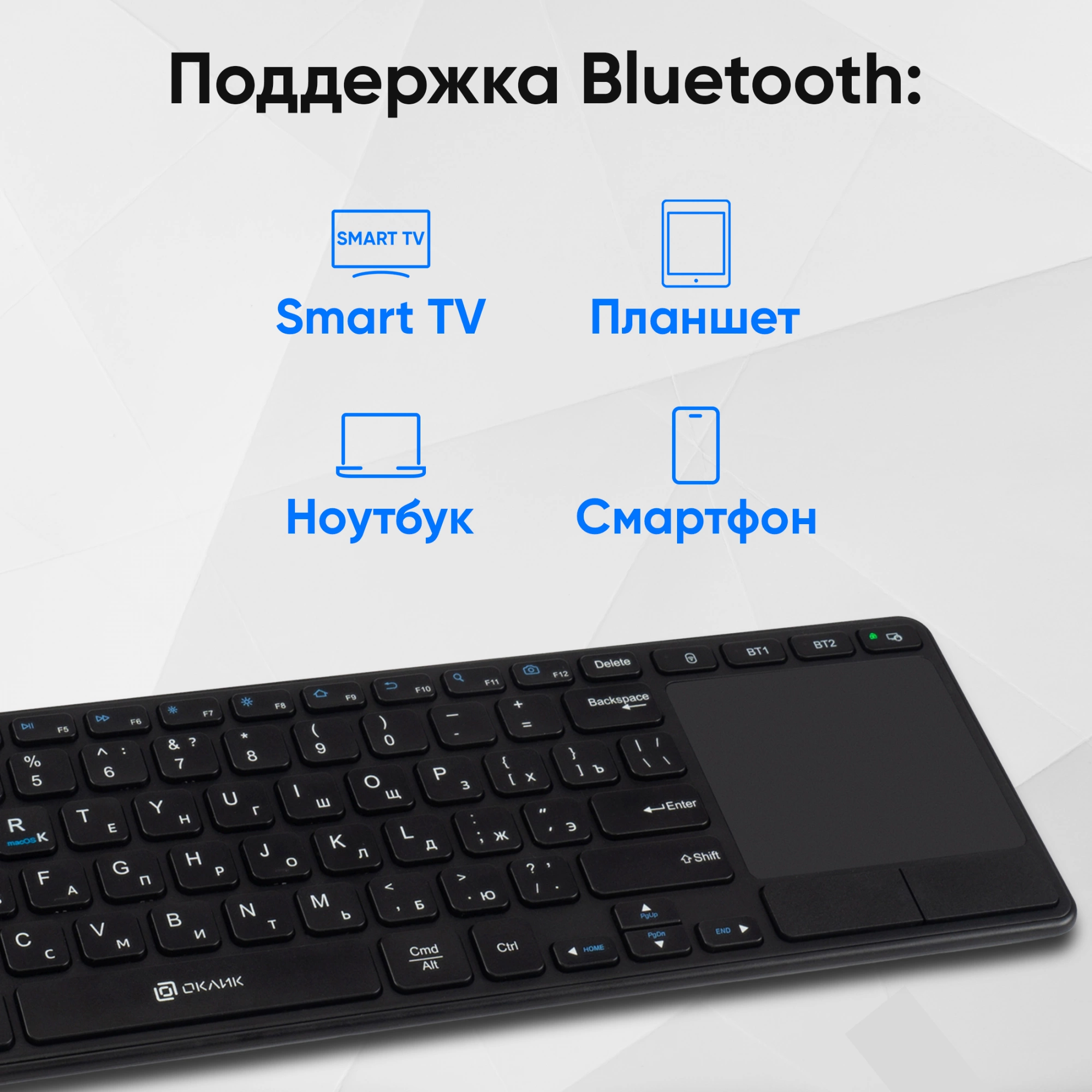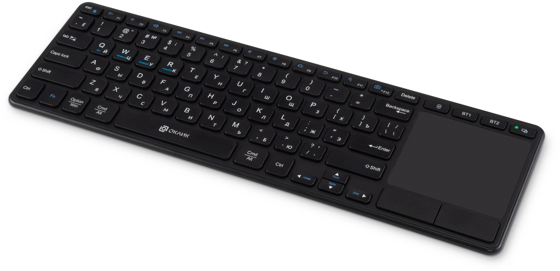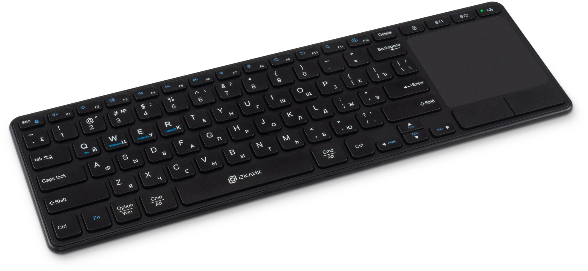 Одна из особенностей Оклик K614W – встроенный тачпад с двумя кнопками, которые выполняют функции правой и левой кнопок мыши. Таким образом модель подойдет для Smart TV или обычного телевизора, к которому подключен ноутбук. Например, можно управлять компьютером или ТВ, сидя в кресле или на диване.