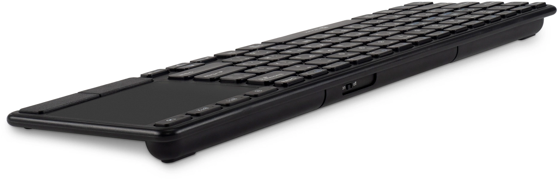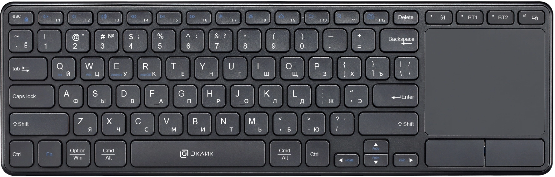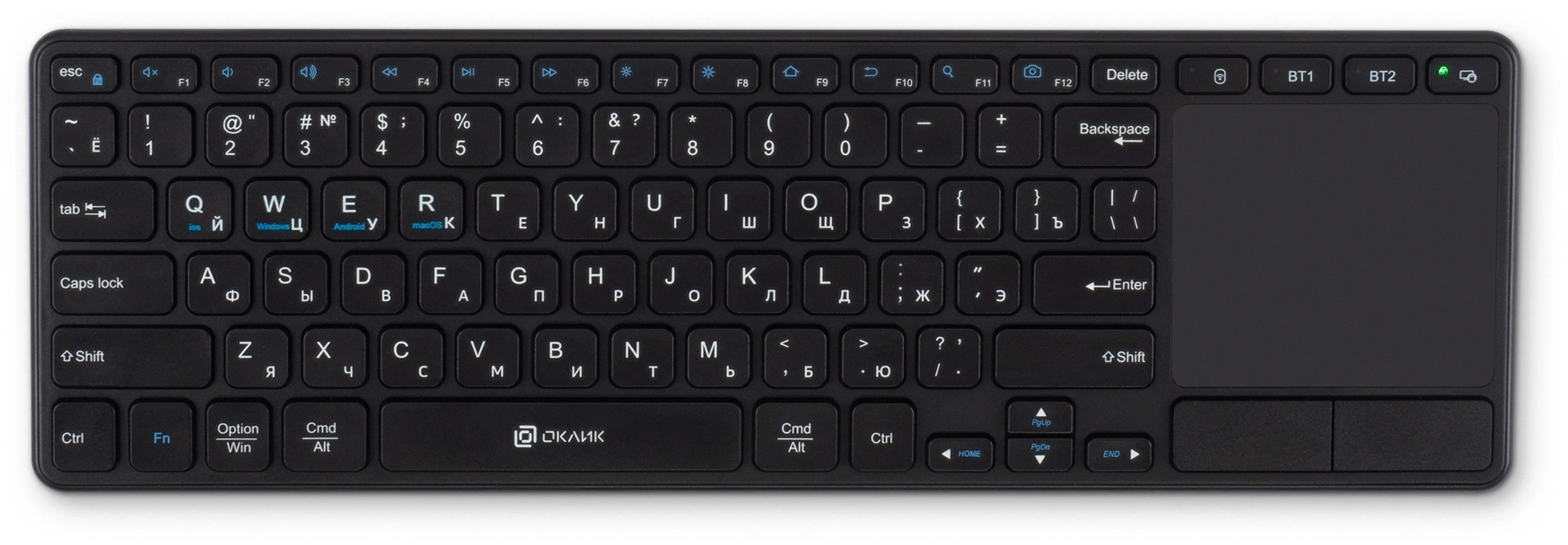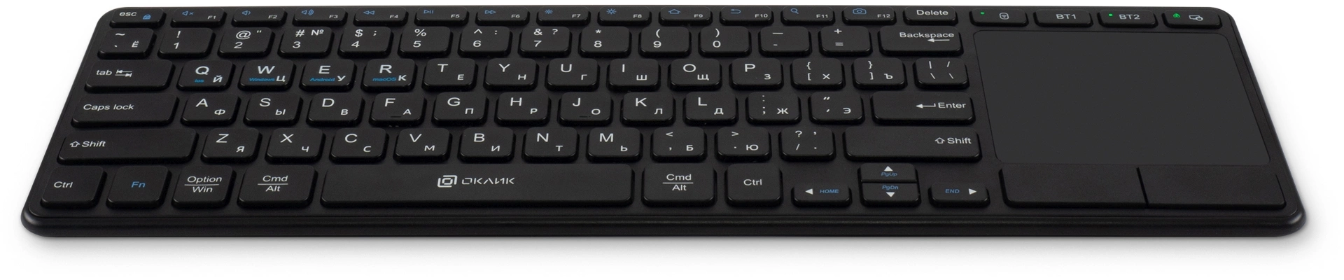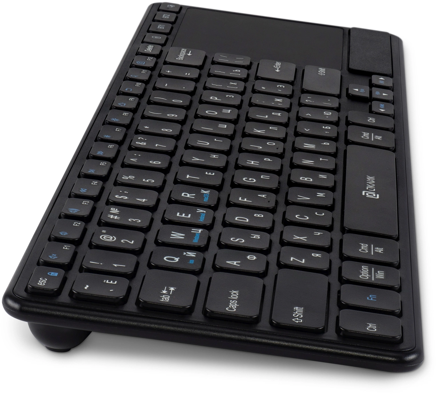 Одна из особенностей Оклик K614W – встроенный тачпад с двумя кнопками, которые выполняют функции правой и левой кнопок мыши. Таким образом модель подойдет для Smart TV или обычного телевизора, к которому подключен ноутбук. Например, можно управлять компьютером или ТВ, сидя в кресле или на диване.