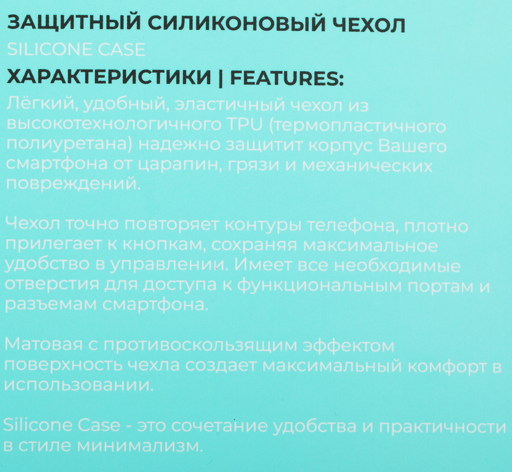 Чехол Silicone Case специально разработан с учётом всех особенностей Вашего смартфона. Благодаря толщине материала не более 0,8мм чехол минимально увеличивает размеры смартфона, при этом защищает заднюю панель от царапин, грязи и пыли, а матовая поверхность предотвращает выскальзывание из рук.