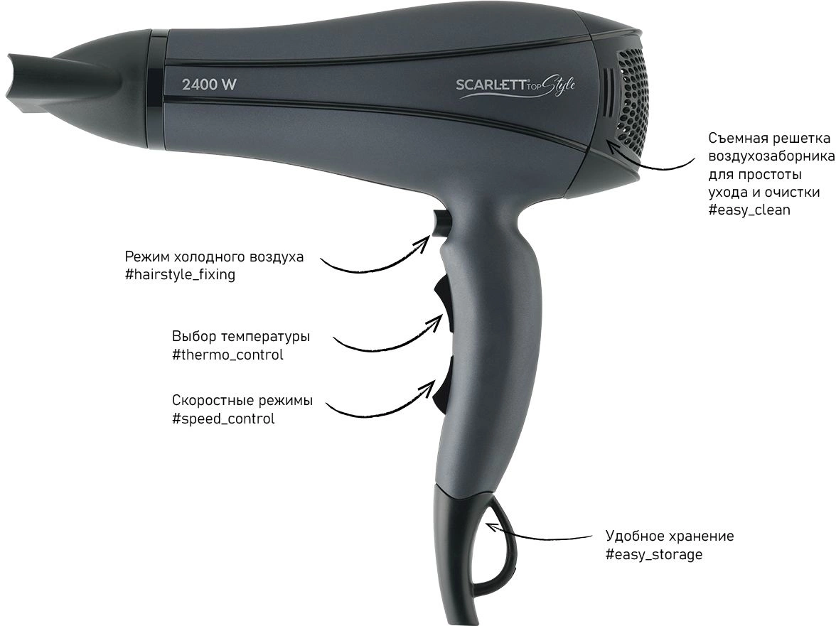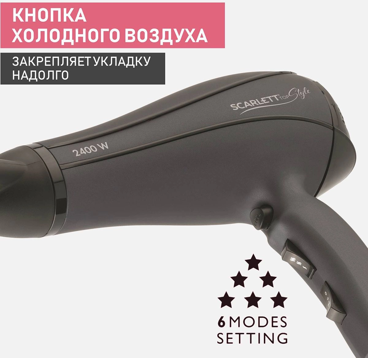 Мощный и стильный фен с функцией ионизации (технология "Advanced tourmaline") и сменными температурными режимами. 2 режима мощности потока воздуха, 3 режима температуры потока воздуха для бережной и быстрой сушки любого типа волос. Режим холодного воздуха для фиксации прически.