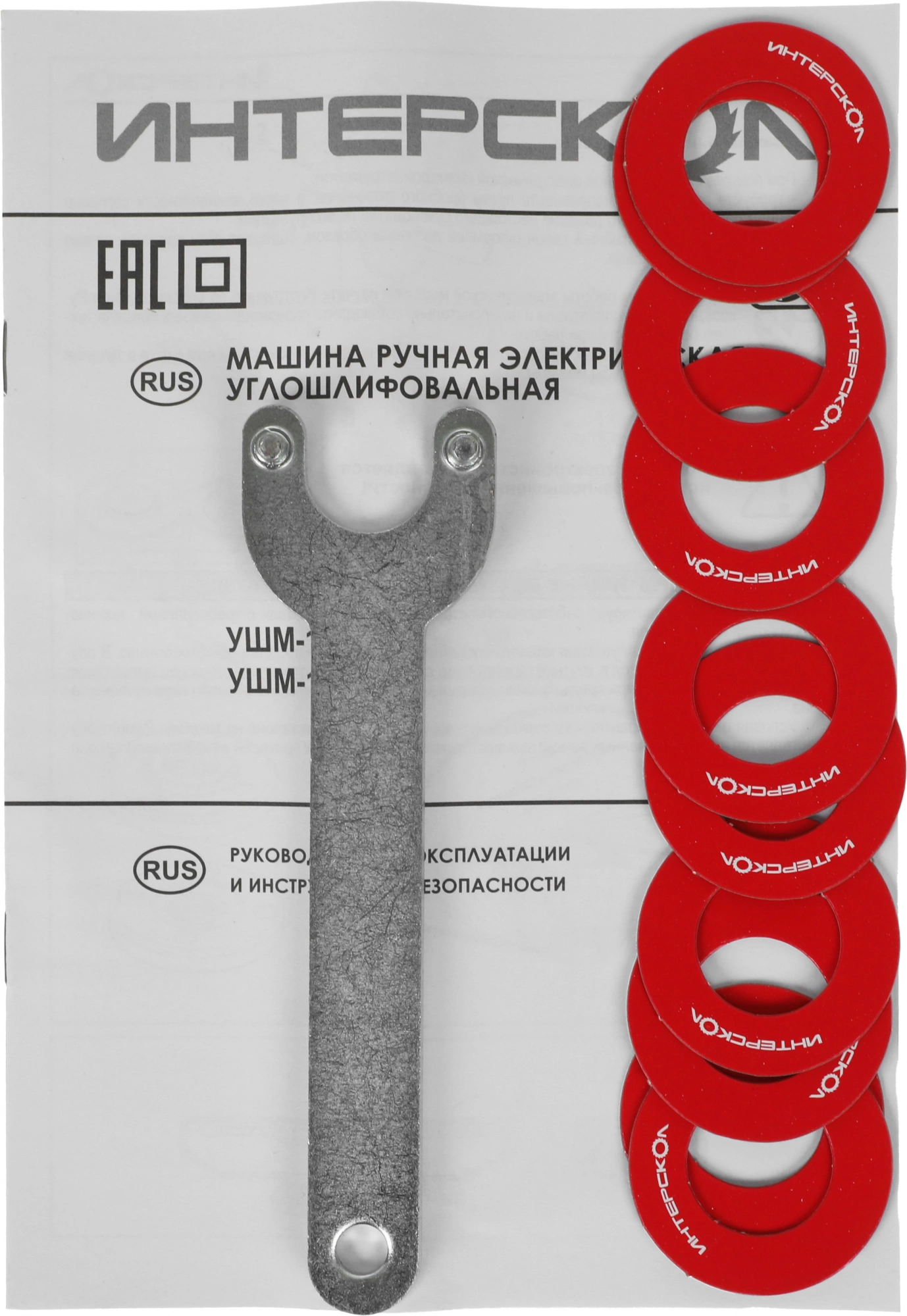 УШМ, руководство по эксплуатации и Инструкция по безопасности, гарантийный талон, кожух защитный (для шлифовальных работ), рукоятка вспомагательная, ключ специальный, упаковка.