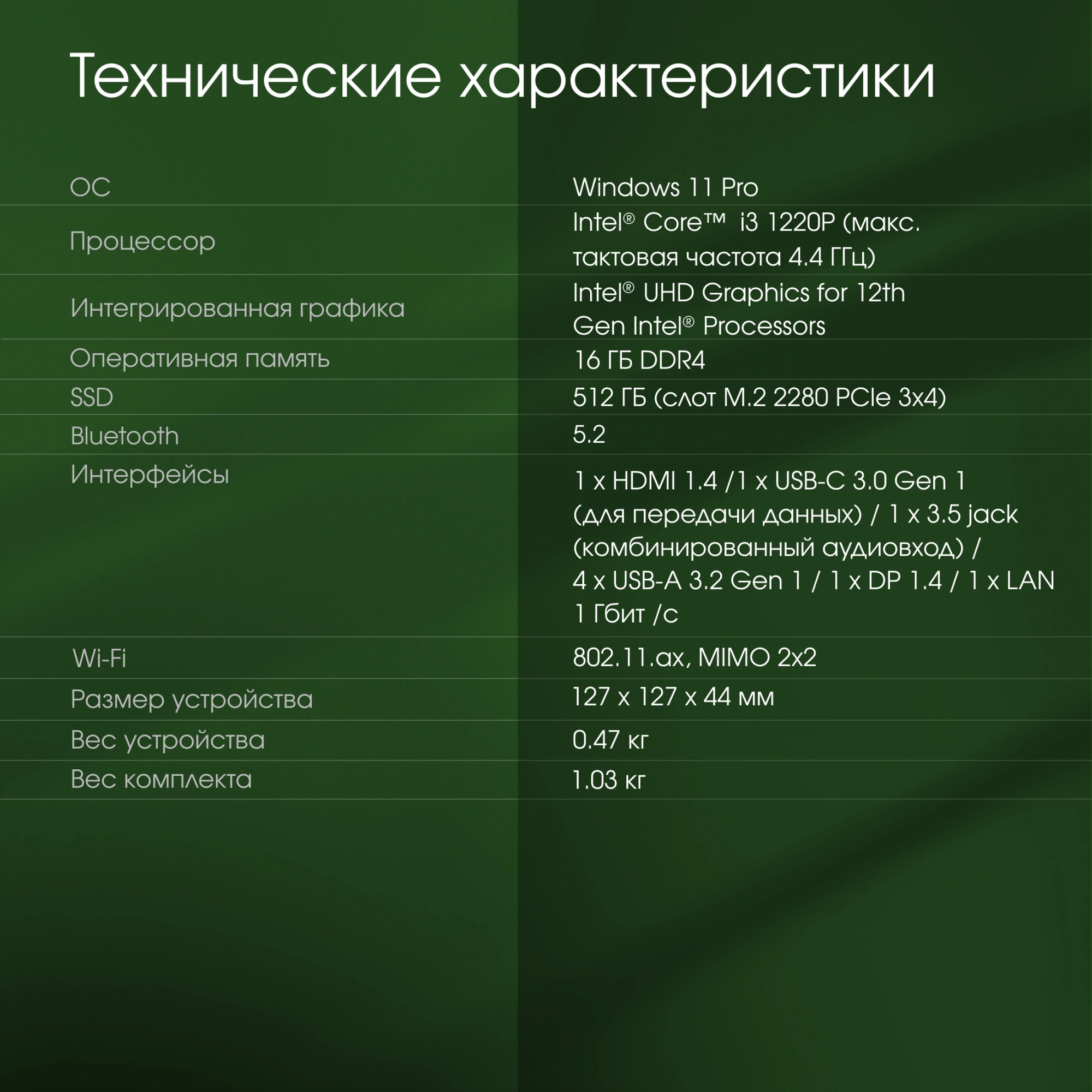 Неттоп Digma Pro Minimax U1 i3 1220P / 16Gb / SSD512Gb UHDG / W11Pro — это компактный и мощный компьютер, который идеально подойдет для работы, учебы и развлечений. Он оснащен процессором Intel Core i3-1220P с тактовой частотой 4400 МГц, что обеспечивает быструю и стабильную работу системы.