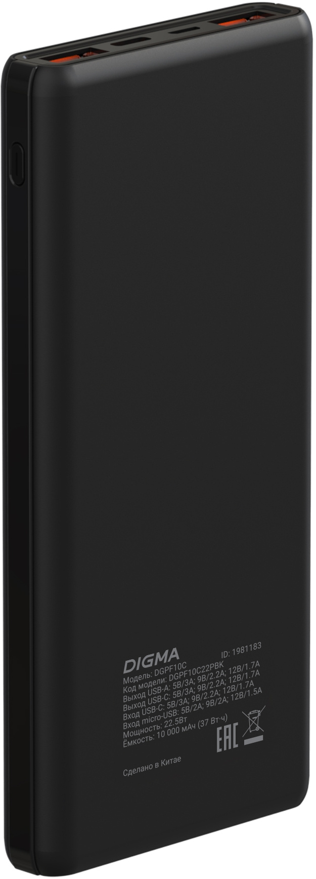 Портативный пауэрбанк Digma DGPF10C емкостью 10 000 мАч поможет не зависеть от розетки, всегда оставаться на связи и пользоваться любимыми гаджетами, когда они вам нужны. Такого аккумулятора хватит на два полных заряда смартфона. Пополняйте запас энергии у планшета, смарт-часов, беспроводных наушников, плеера в любом месте и в необходимое вам время. Аксессуар оборудован двумя портами USB-A и одним USB-C. Это позволит заряжать одновременно три устройства.