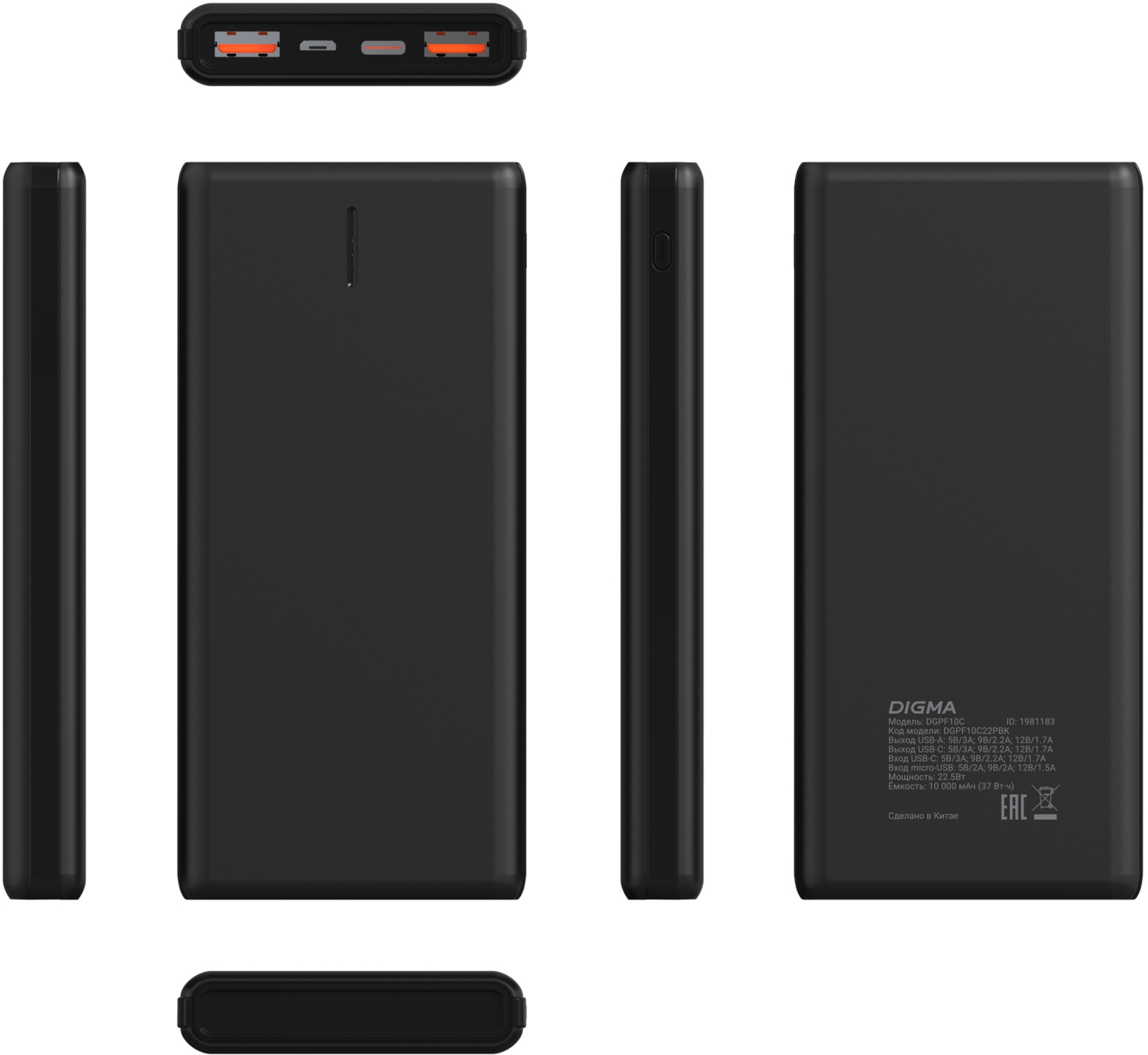 Digma DGPF10C оснащен световым индикатором уровня заряда. Он поможет определить, сколько заряда осталось. Встроенная защита от перегрева и короткого замыкания обеспечит безопасную эксплуатацию аккумулятора и продлит срок службы устройства. Модель выполнена в гладком минималистичном черном корпусе. Вес аксессуара составляет 220 г, размеры – 141 х 66 х 16 мм. Берите его с собой в дорогу, командировки и путешествия: пауэрбанк поместится даже в небольшой сумке.