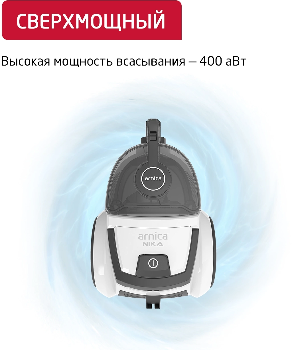 Мощный пылесос Arnica Nika с циклонной системой фильтрации Cyclone MAX Technology. Для сбора мусора используется контейнер объемом 2.5 литров. Мощность двигателя 2000Вт. Мощность всасывания 400Вт. Насадок в комплекте - 2