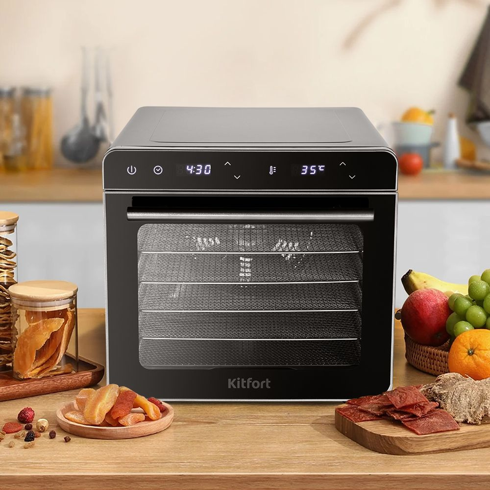 Электрическая сушилка Kitfort предназначена для сушки овощей, фруктов, ягод, грибов, корнеплодов, трав и зелени, а также мяса и рыбы, хлеба. С КТ-1948 у вас всегда будет живая еда!